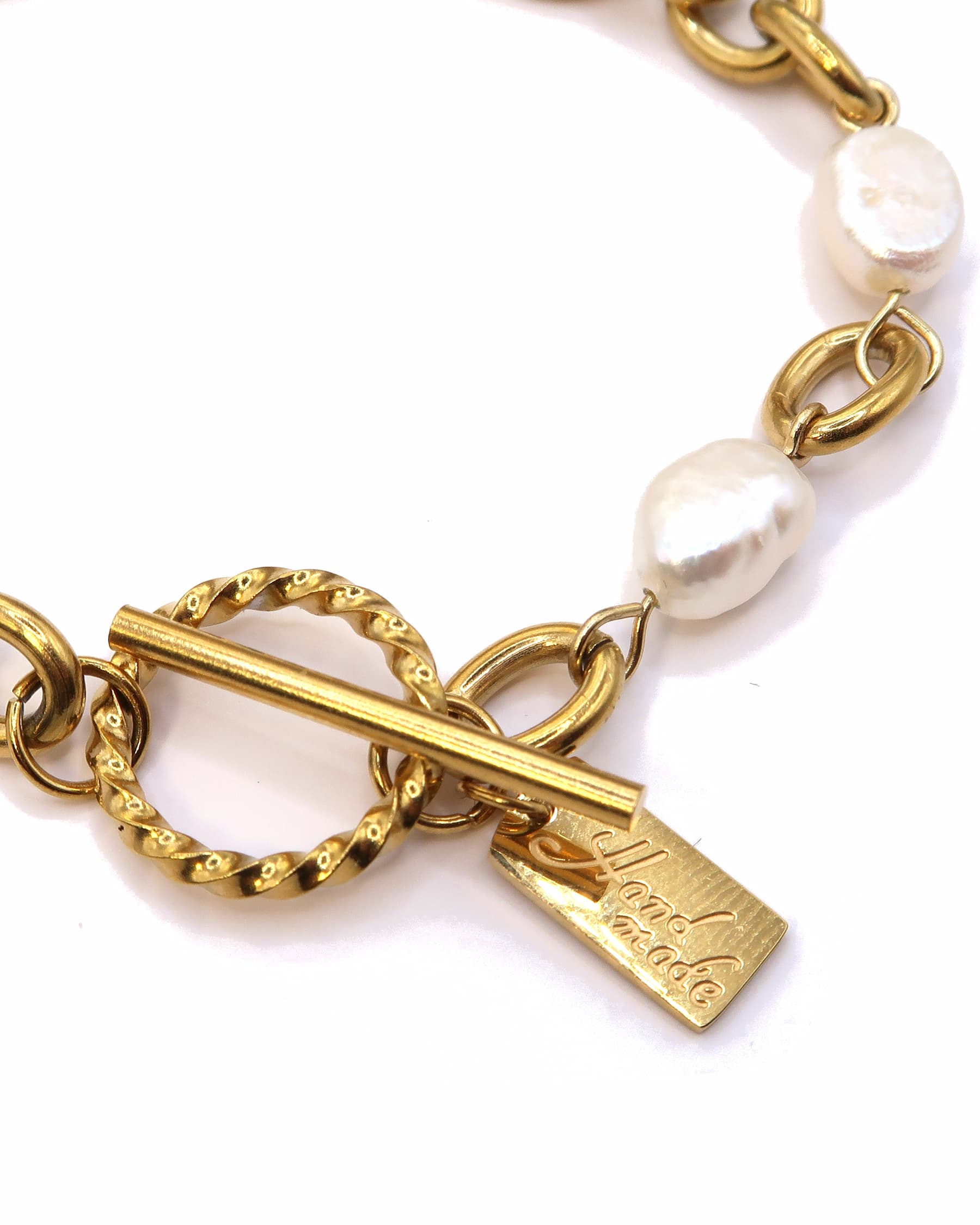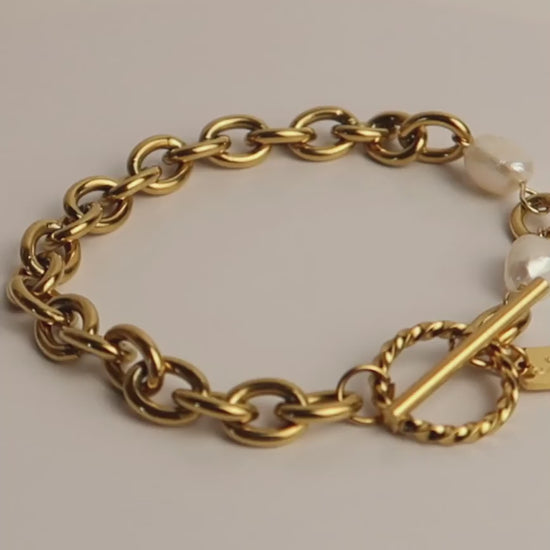 Das goldene Chunky Gliederarmband ALBA aus Edelstahl kombiniert moderne Stärke mit femininer Eleganz. Zwei Glieder sind durch natürliche Süßwasserperlen ersetzt, der Knebelverschluss rundet das Design ab. Ein einzigartiges Schmuckstück, wasserfest und ideal für den Alltag.