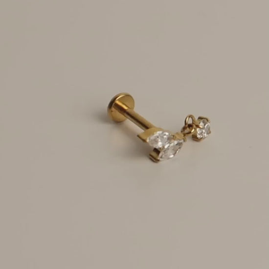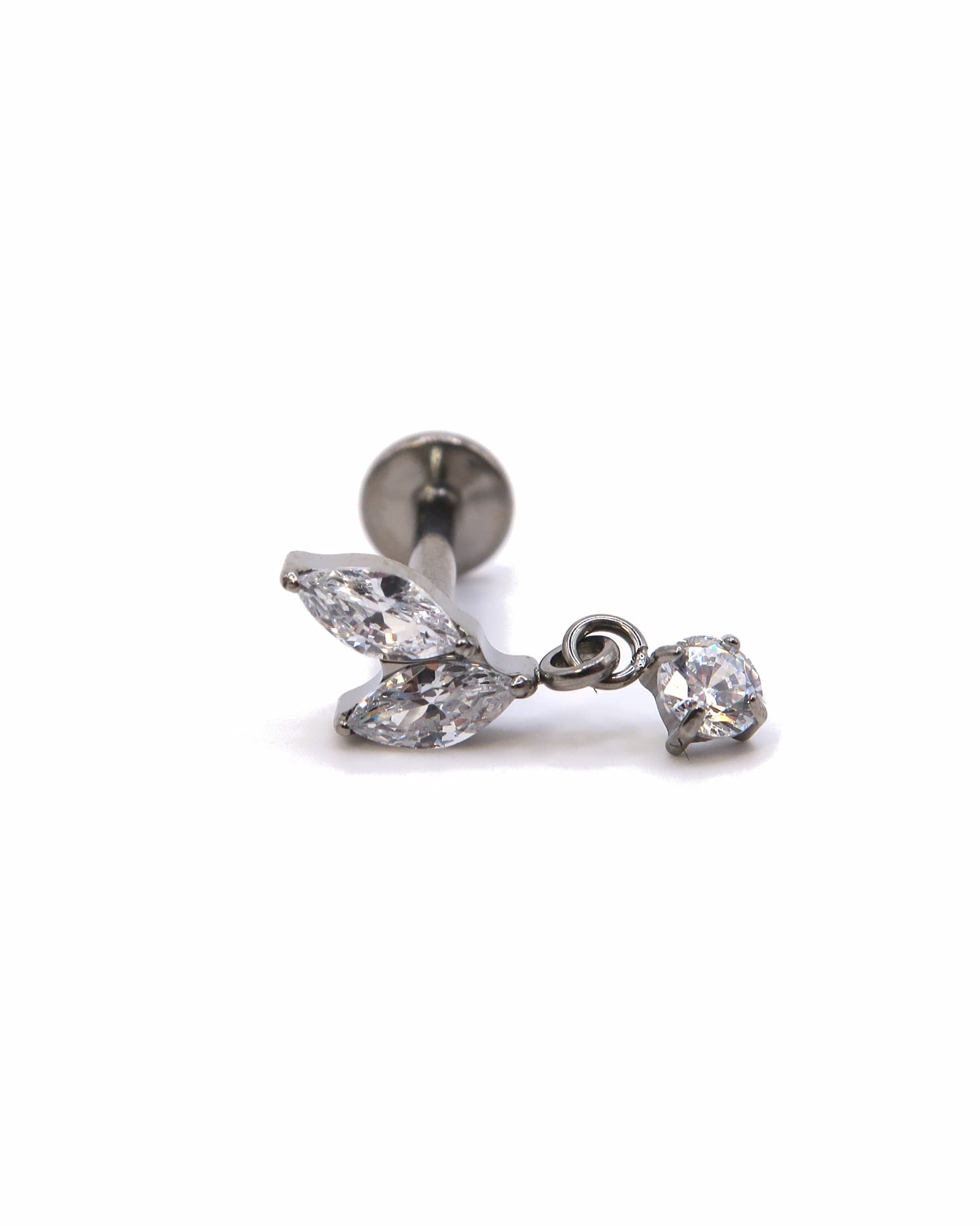 ALORA ist ein elegantes Helix Piercing aus hochwertigem Titan, erhältlich in Gold und Silber. Das Design besteht aus zwei funkelnden Zirkon-Blättern, an denen ein kleiner, runder Anhänger mit einem weiteren Zirkonstein frei schwingt. Dank des Innengewindes ist es besonders angenehm zu tragen – perfekt für einen stilvollen Look mit besonderem Detail.