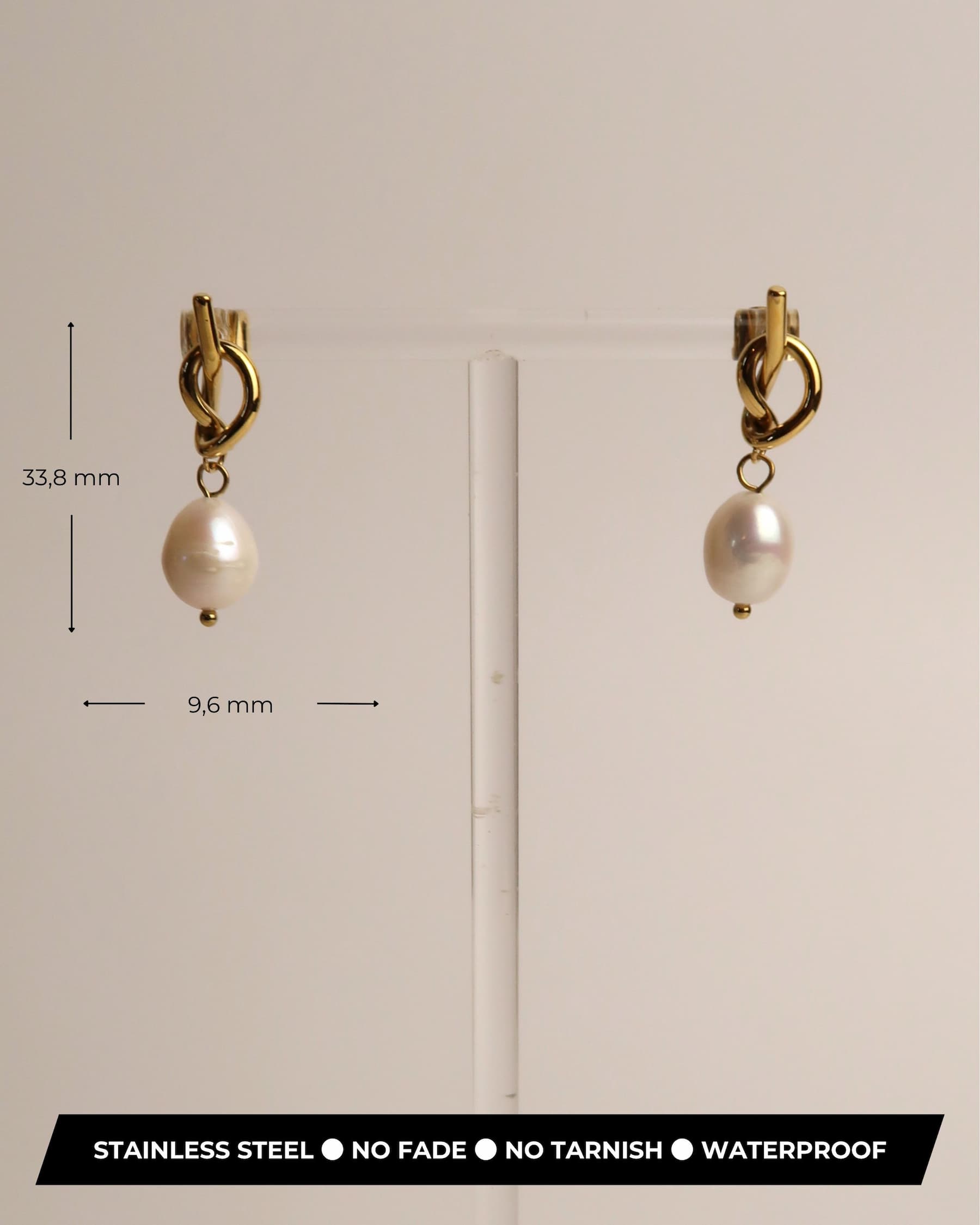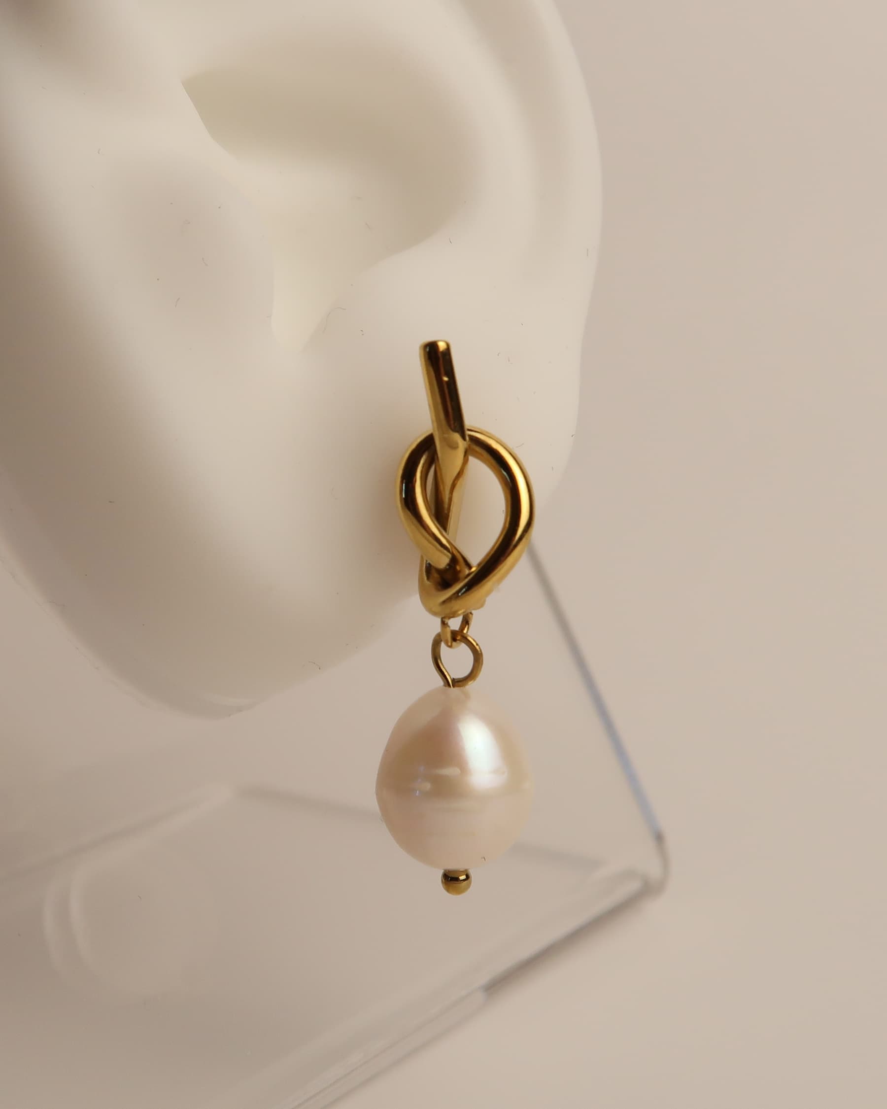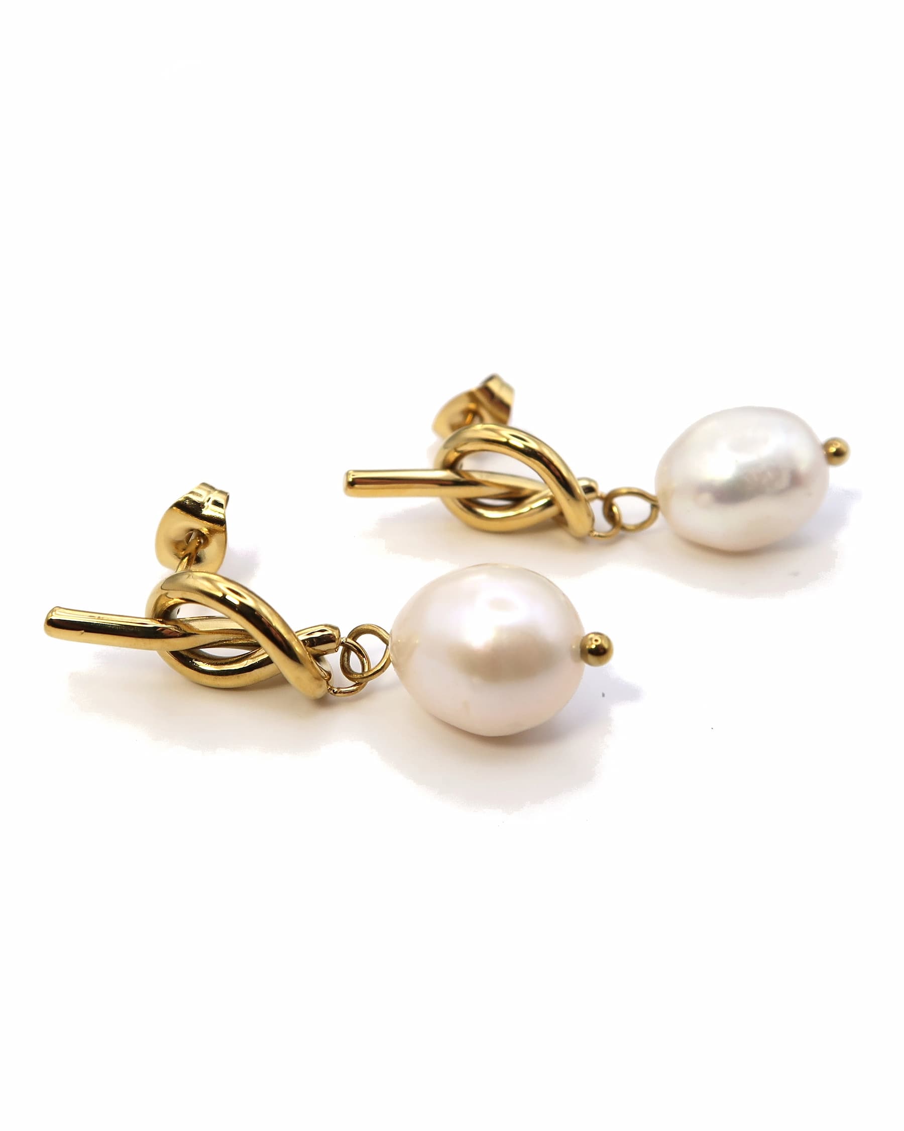 Die ARLET Ohrringe aus goldfarbenem Edelstahl kombinieren ein modernes Knotendesign mit einer eleganten weißen Süßwasserperle. Ein dezentes und vielseitiges Paar, das sich sowohl im Alltag als auch zu besonderen Anlässen tragen lässt.