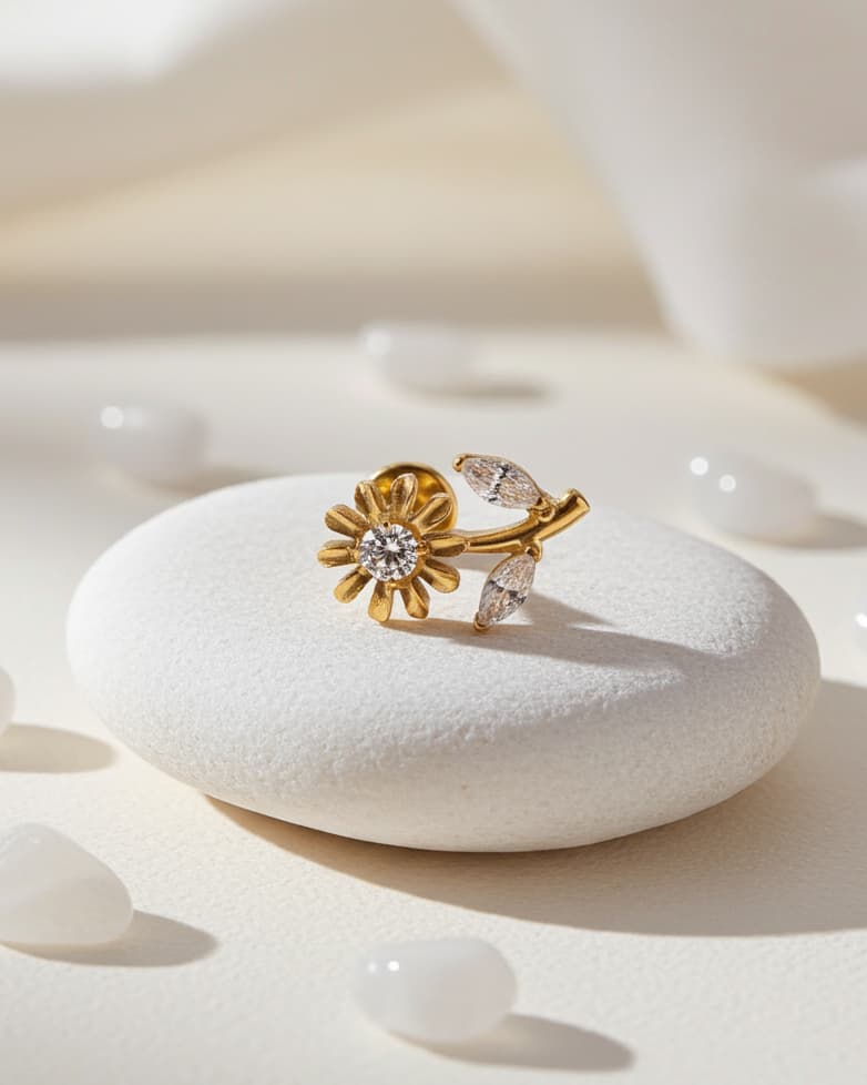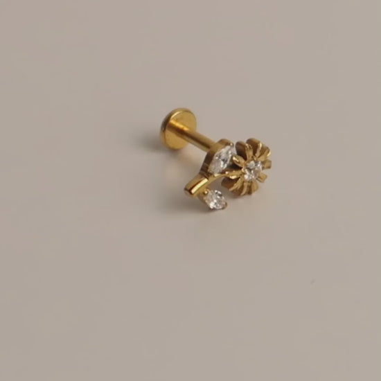 BREE ist ein zartes Helix Piercing aus Titan mit einem verspielten Blumen-Design. Die Blätter und das Innere der Blüte sind mit funkelnden Zirkonia besetzt. Dank Innengewinde lässt es sich angenehm tragen – ideal für den Alltag oder besondere Anlässe.