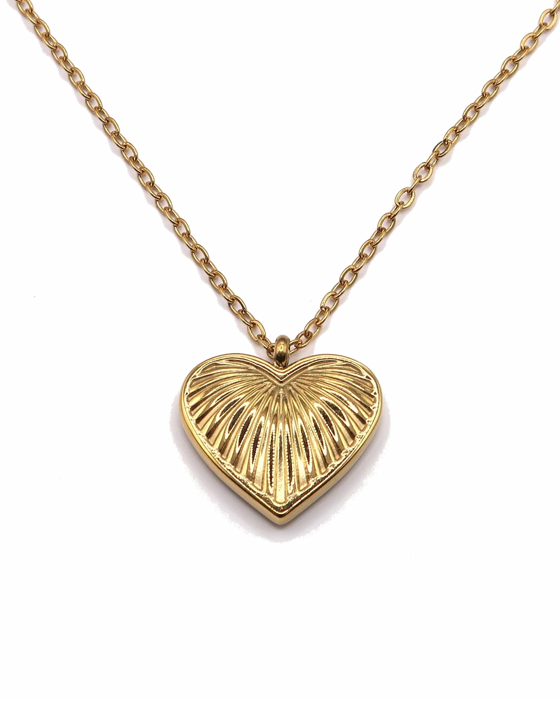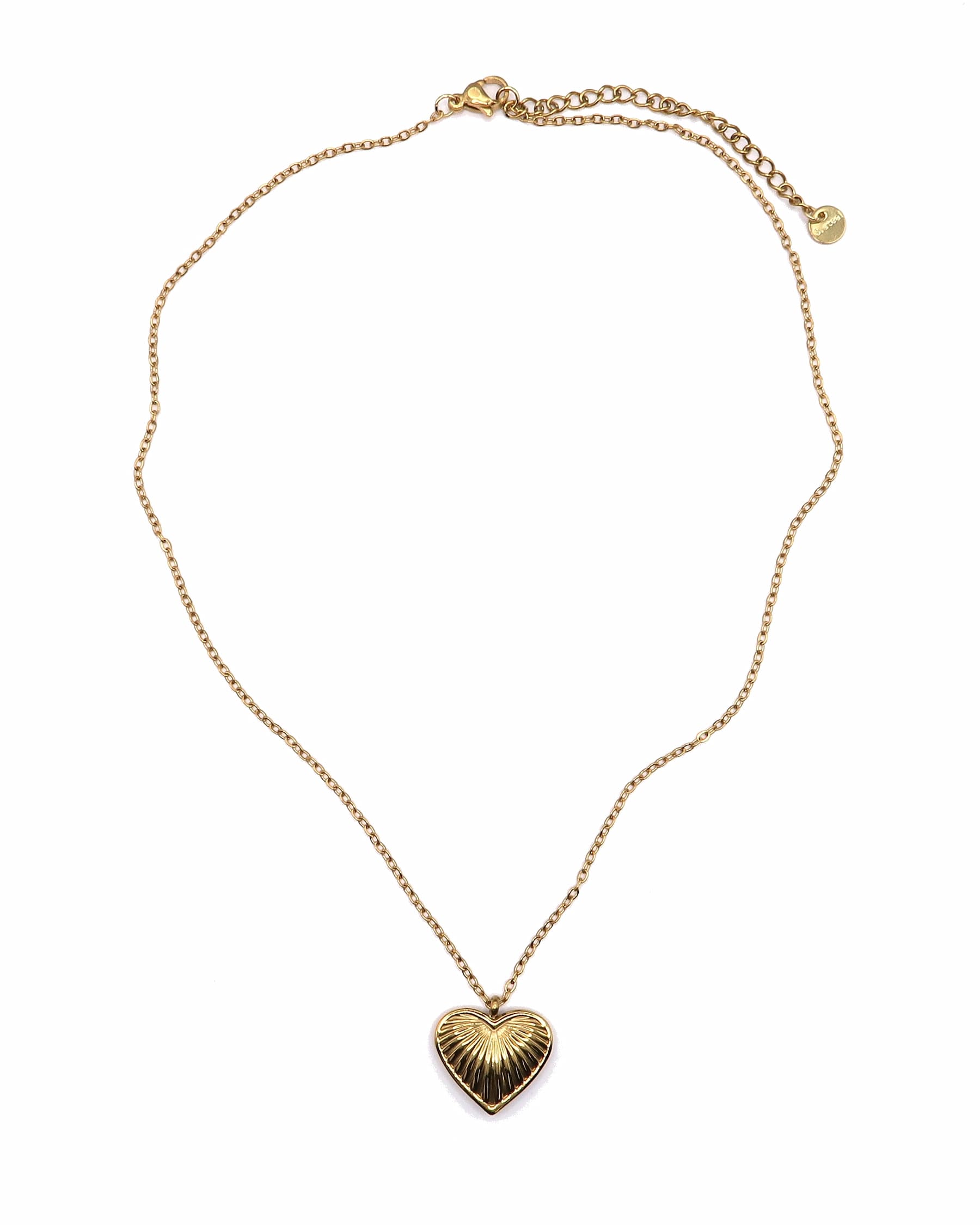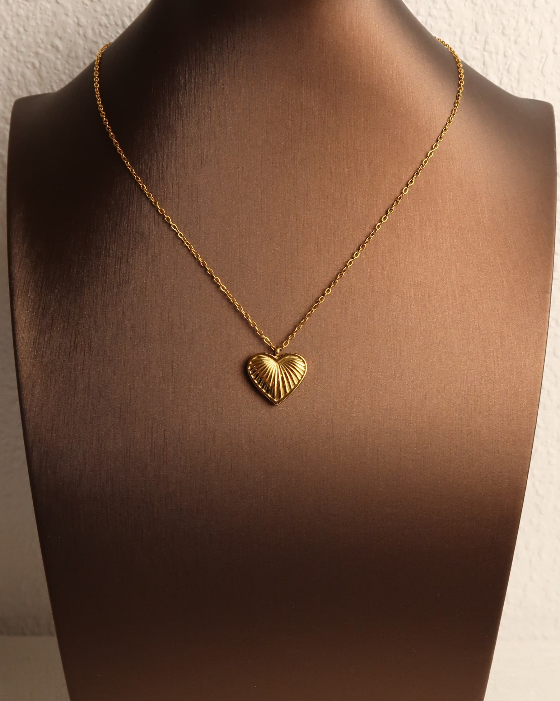 CLEMENTINE ist eine goldene Edelstahl-Halskette mit herzförmigem Anhänger in Reliefoptik. Sie eignet sich perfekt für moderne Layering-Looks, lässt sich aber auch alleine stilvoll tragen. Das robuste Material sorgt für Langlebigkeit und Farbbeständigkeit im Alltag.