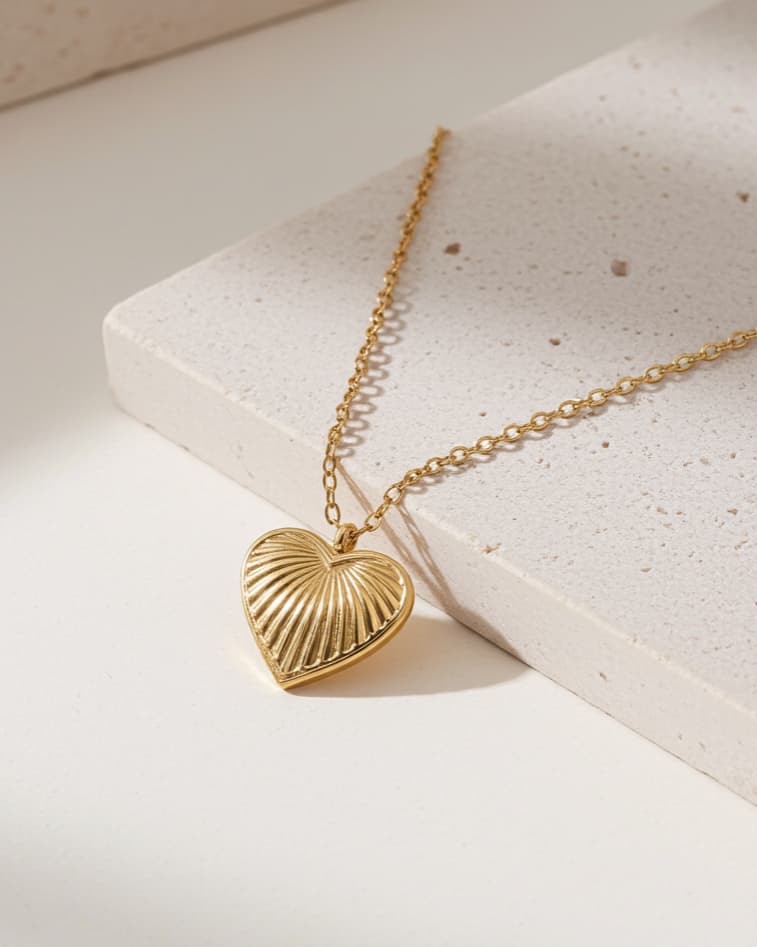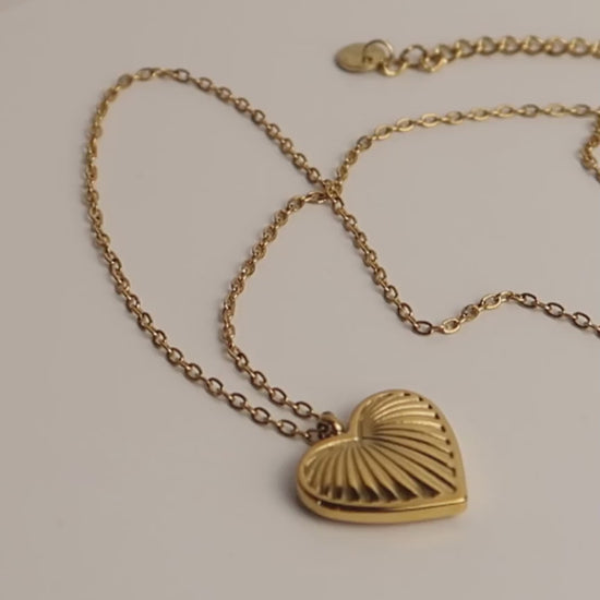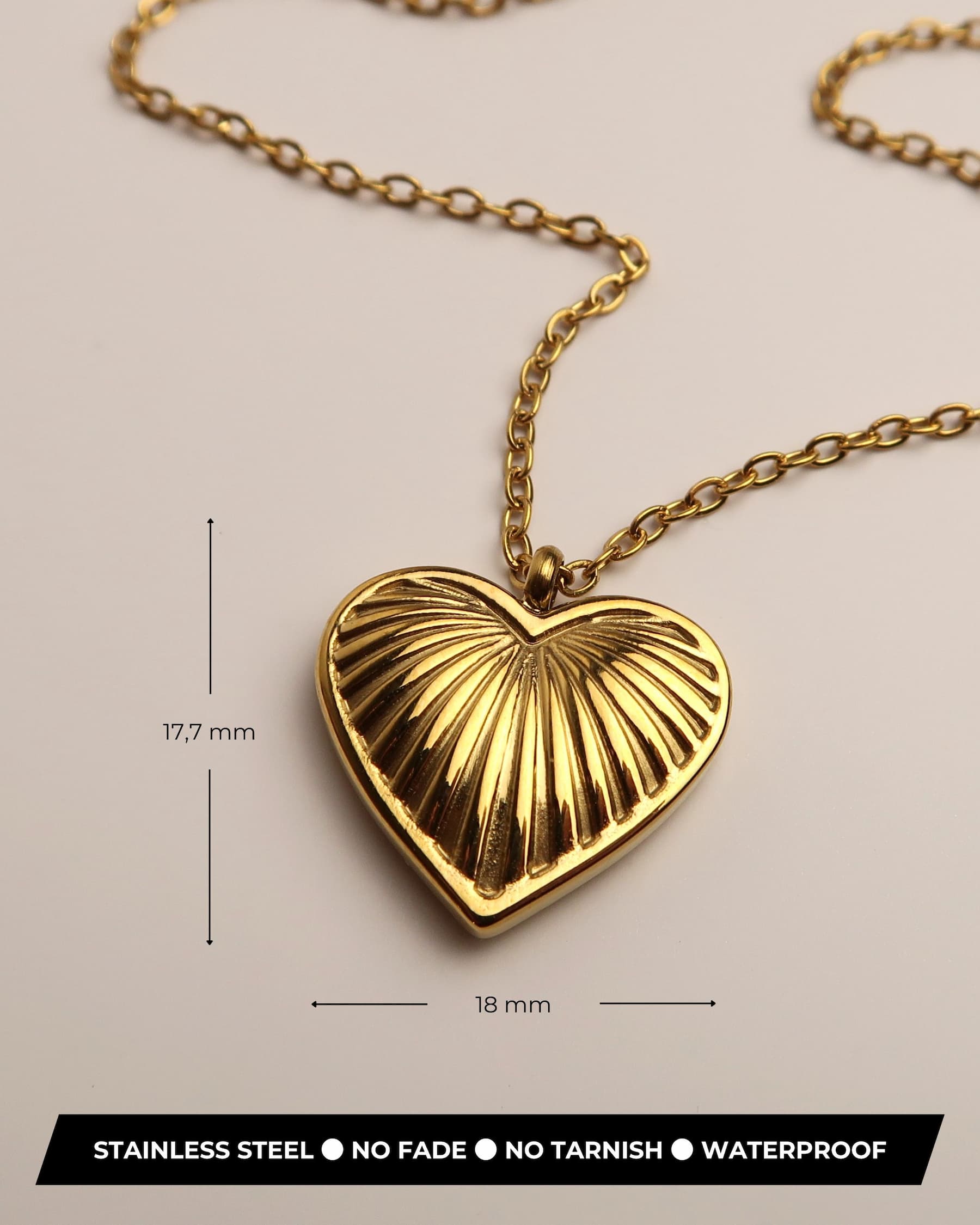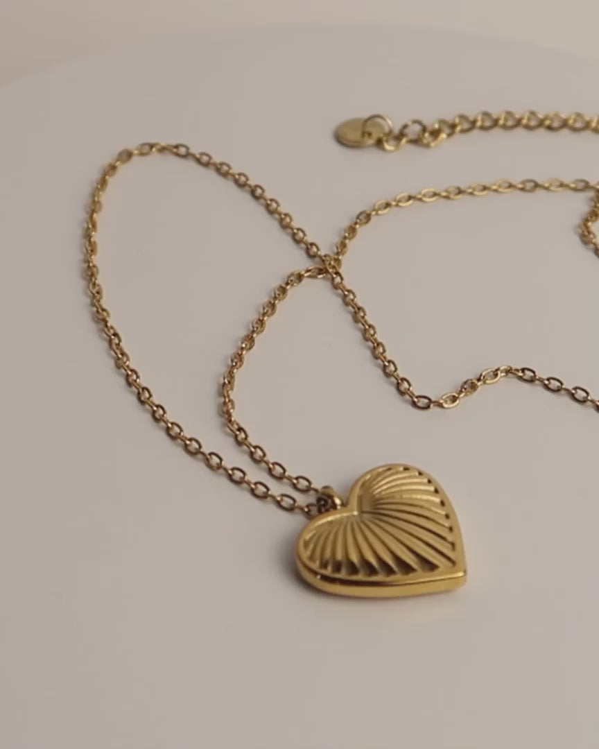 CLEMENTINE ist eine goldene Edelstahl-Halskette mit herzförmigem Anhänger in Reliefoptik. Sie eignet sich perfekt für moderne Layering-Looks, lässt sich aber auch alleine stilvoll tragen. Das robuste Material sorgt für Langlebigkeit und Farbbeständigkeit im Alltag.