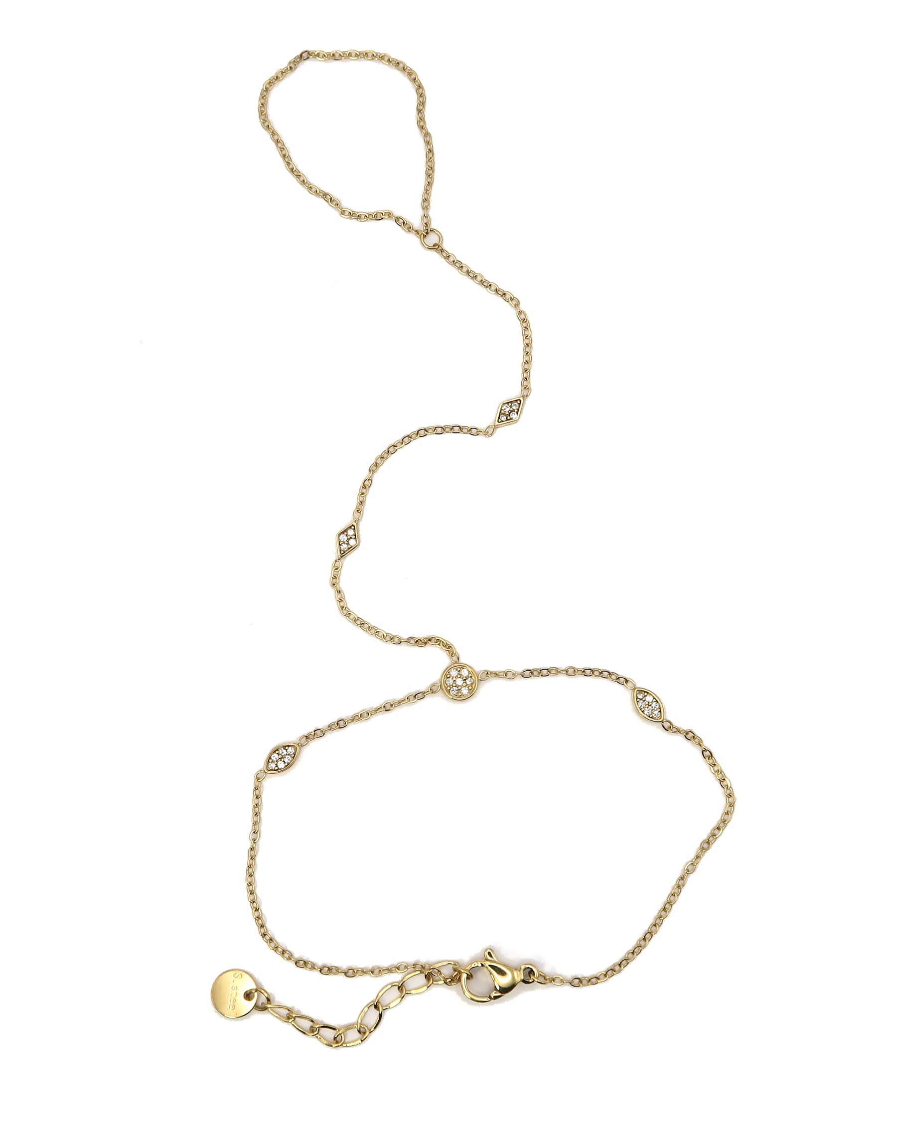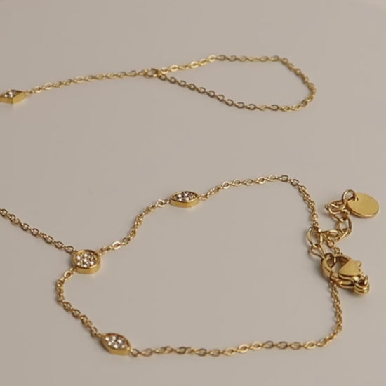 ERIDA ist eine feine Handkette aus Edelstahl, geschmückt mit funkelnden Zirkonen in verschiedenen Formen. Runde, ovale und rautenförmige Elemente verleihen dem Design einen verspielten, eleganten Charakter. Erhältlich in Gold und Silber, wasserfest und angenehm leicht – perfekt für dezente Akzente im Alltag oder besondere Anlässe.
