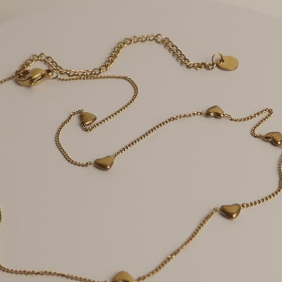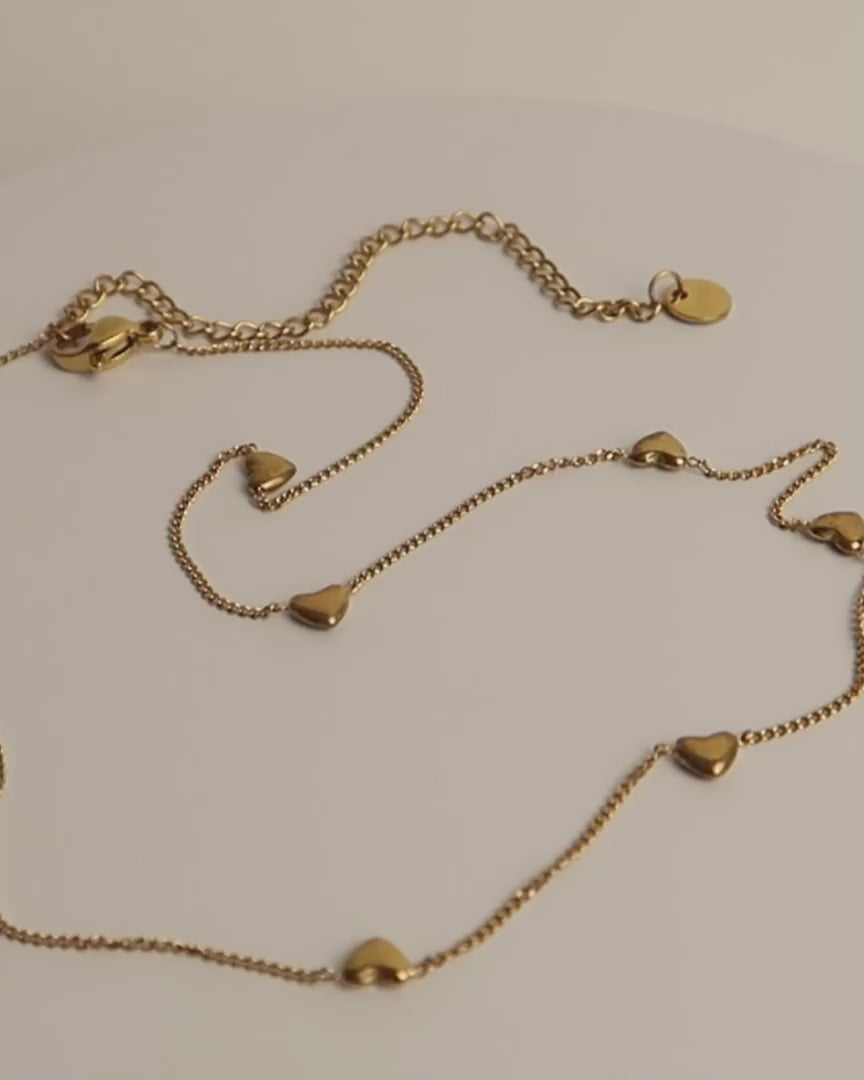 GINNY ist ein zarter Choker aus goldfarbenem Edelstahl, verziert mit kleinen, gleichmäßig angeordneten Herzen. Das minimalistische Design macht ihn zu einem vielseitigen Accessoire, perfekt für den Alltag oder als Layering-Piece in modernen Looks.