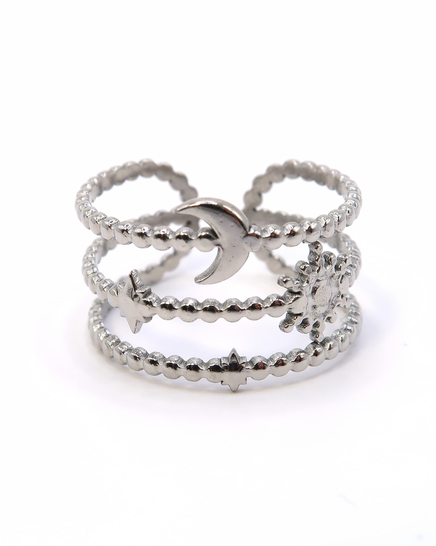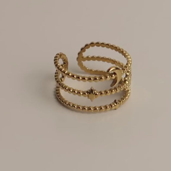 Der ISALINE Ring verbindet himmlische Symbole mit modernem Design. Drei filigrane, miteinander verbundene Edelstahlbänder bilden die Basis, verziert mit einem Mond, einer Sonne und funkelnden Sternen. In Gold und Silber erhältlich und größenverstellbar, ist er das perfekte Statement-Piece für deinen Alltag.