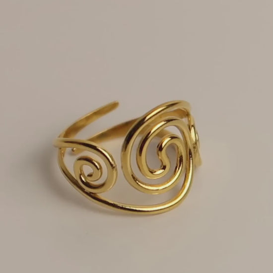 Der goldene Edelstahl Spiralring besticht durch sein modernes Design aus einer großen und zwei kleineren Spiralen. Wasserfest, größenverstellbar und vielseitig tragbar, ist er ein einzigartiges Statement-Schmuckstück für jeden Anlass.