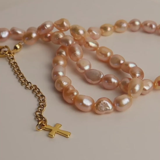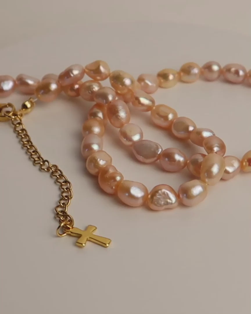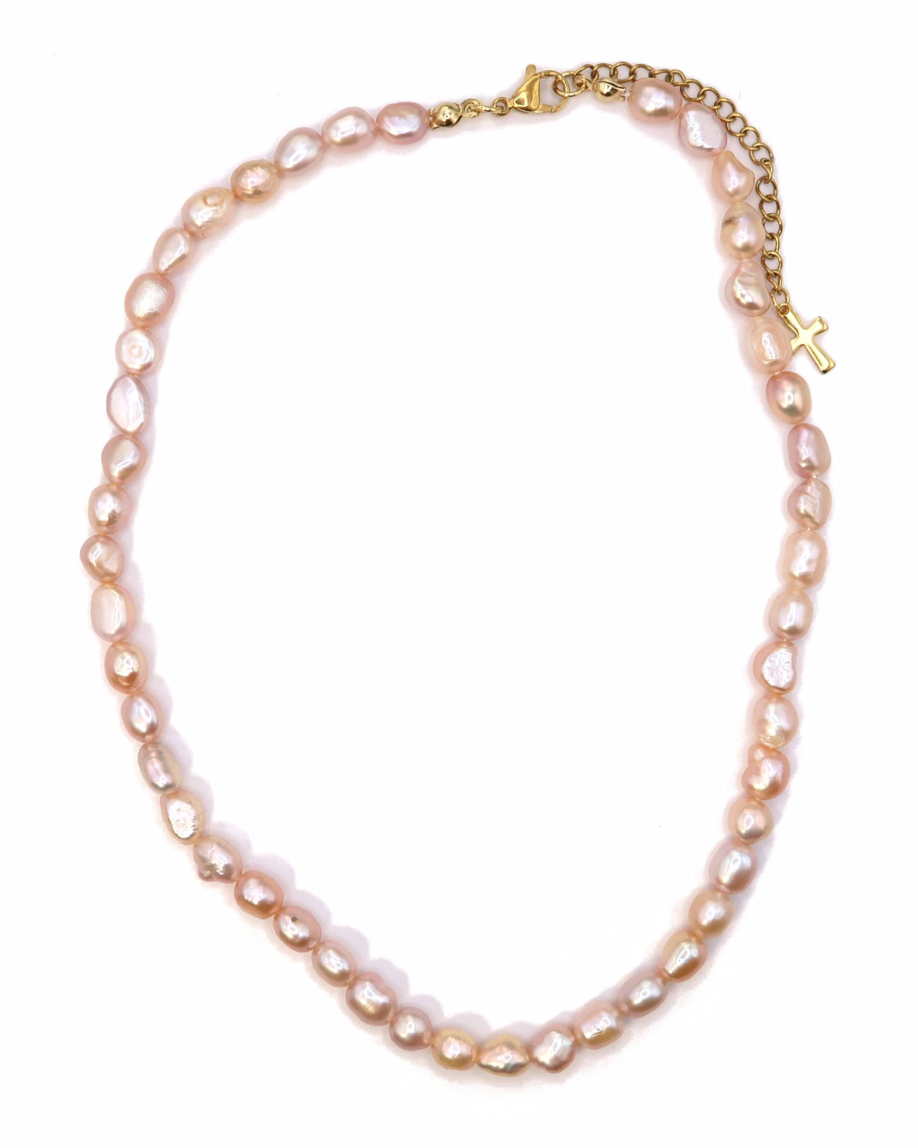 Die LANA Halskette besteht aus unregelmäßigen, ovalen Süßwasserperlen in einem eleganten Orangeton. Der goldene Edelstahlverschluss mit einem kleinen Kreuz an der Verlängerungskette verleiht ihr eine edle Note. Eine stilvolle Kette, die sich perfekt für besondere Anlässe oder den Alltag eignet.