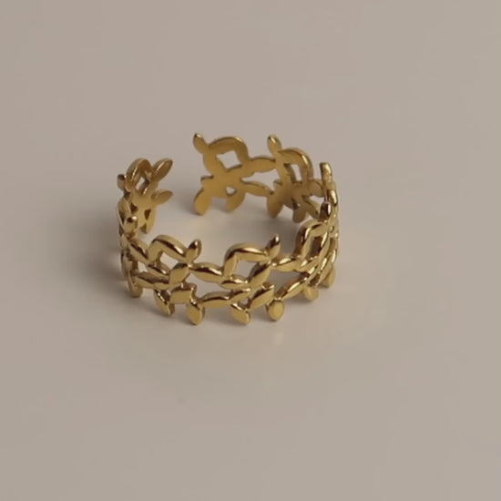 LIV ist ein größenverstellbarer Edelstahlring mit einem breiten, filigranen Blatt-Design. Die Cut-Out Details schaffen einen leichten, luftigen Look, der sich vielseitig zu verschiedenen Stilen kombinieren lässt – perfekt für jeden Anlass.