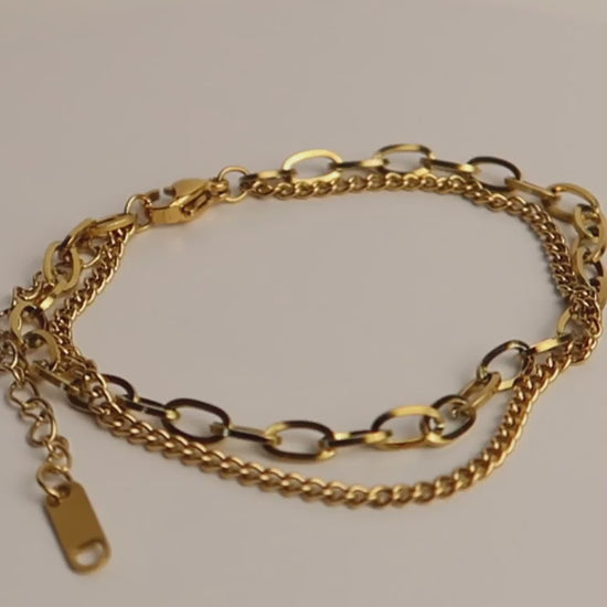 MALYA ist ein schlichtes, goldenes Edelstahl-Doppelarmband bestehend aus zwei kontrastierenden Ketten – einer ovalen Gliederkette und einer feinen kubanischen Kette. Minimalistisch, modern und ideal für den Alltag oder zum Layern.