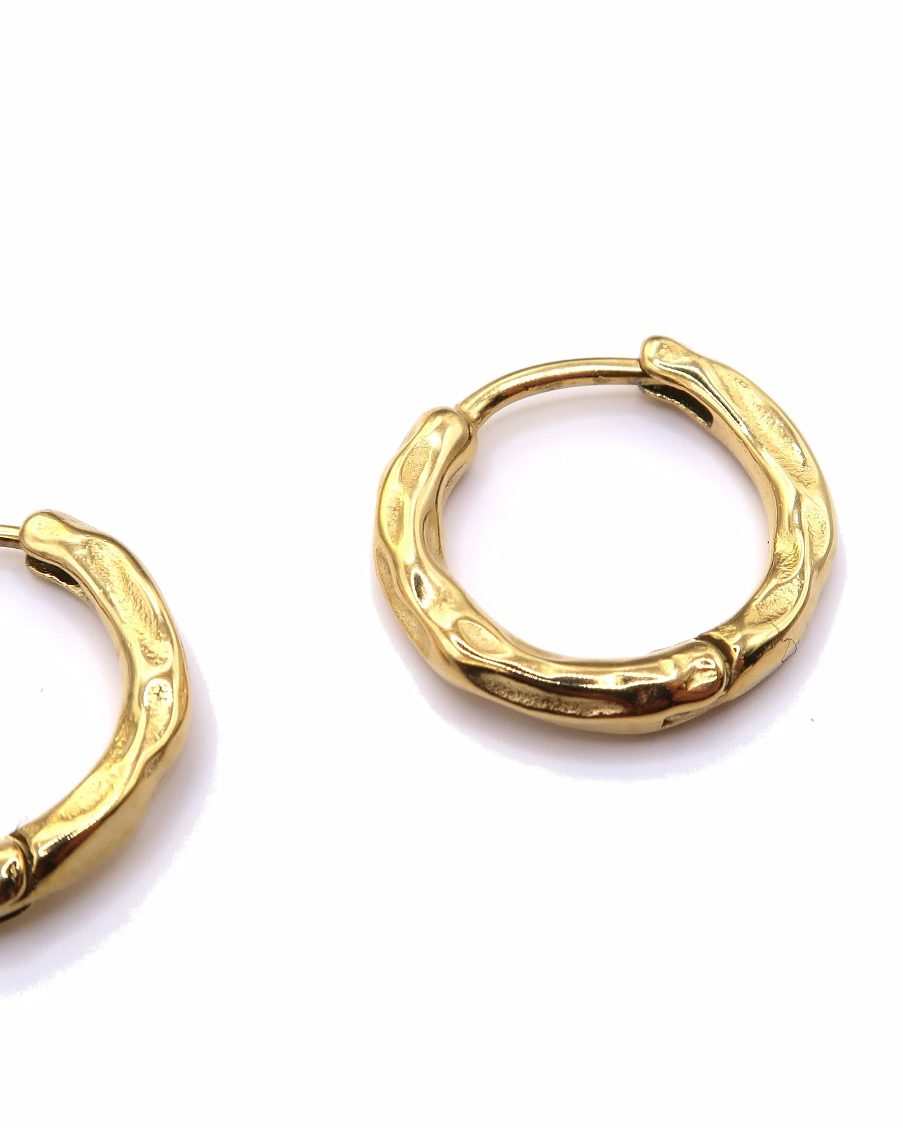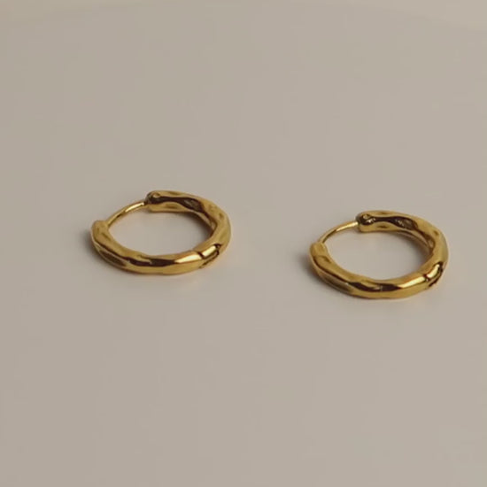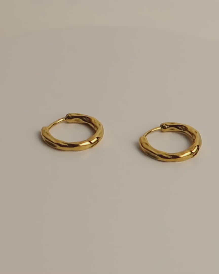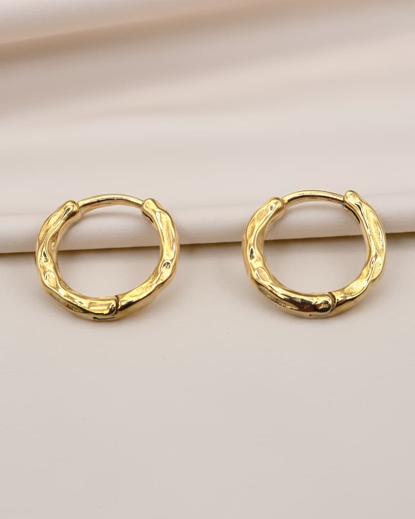 RENA ist ein Paar minimalistische Huggie-Ohrringe aus goldfarbenem Edelstahl, das mit einer dezenten, gehämmerten Textur veredelt ist. Die unregelmäßige Oberfläche fängt das Licht sanft ein und verleiht den kleinen Creolen einen modernen, organischen Look. Leicht, schlicht und elegant – ideal für den Alltag oder als dezentes Detail in deinem Earstack.