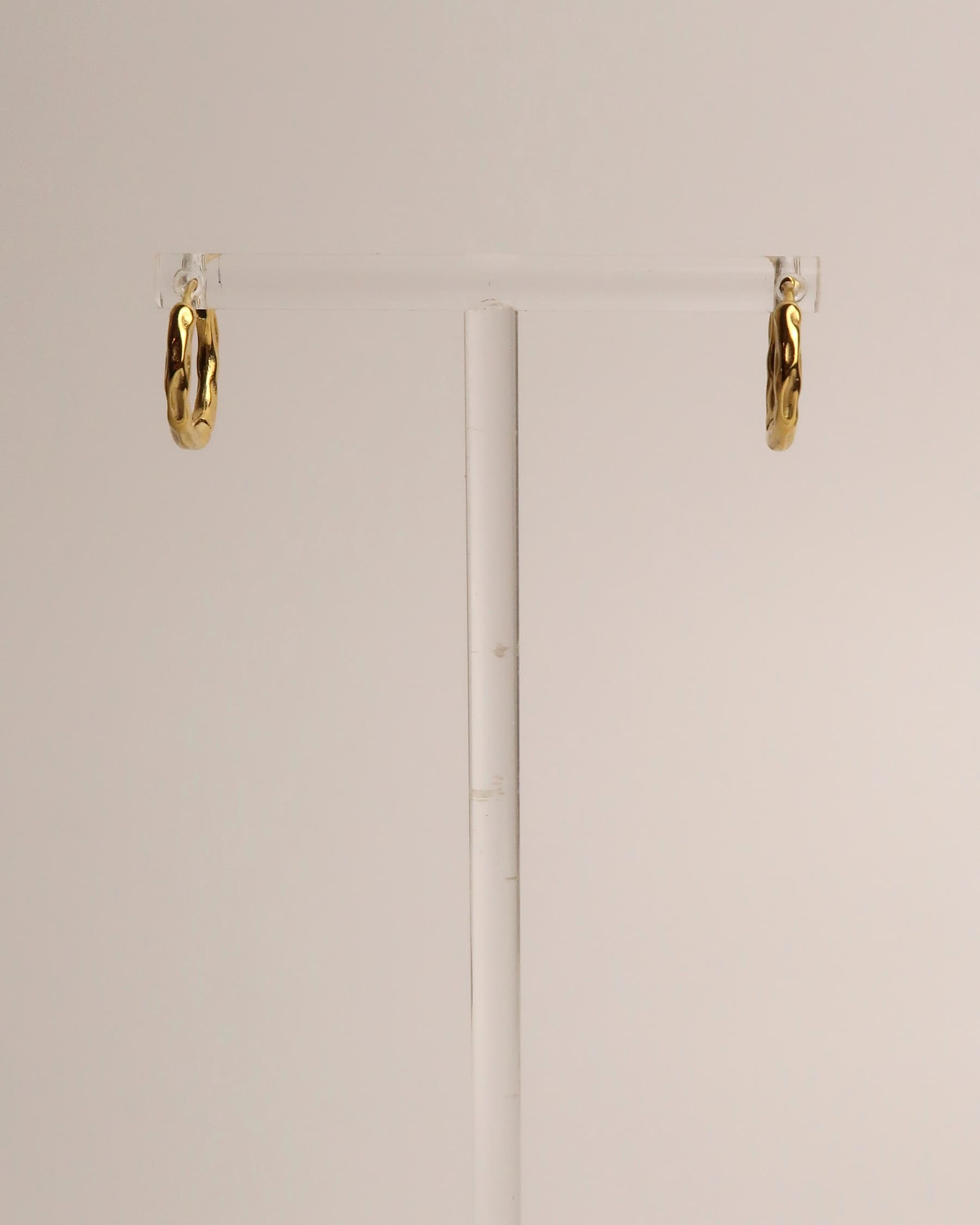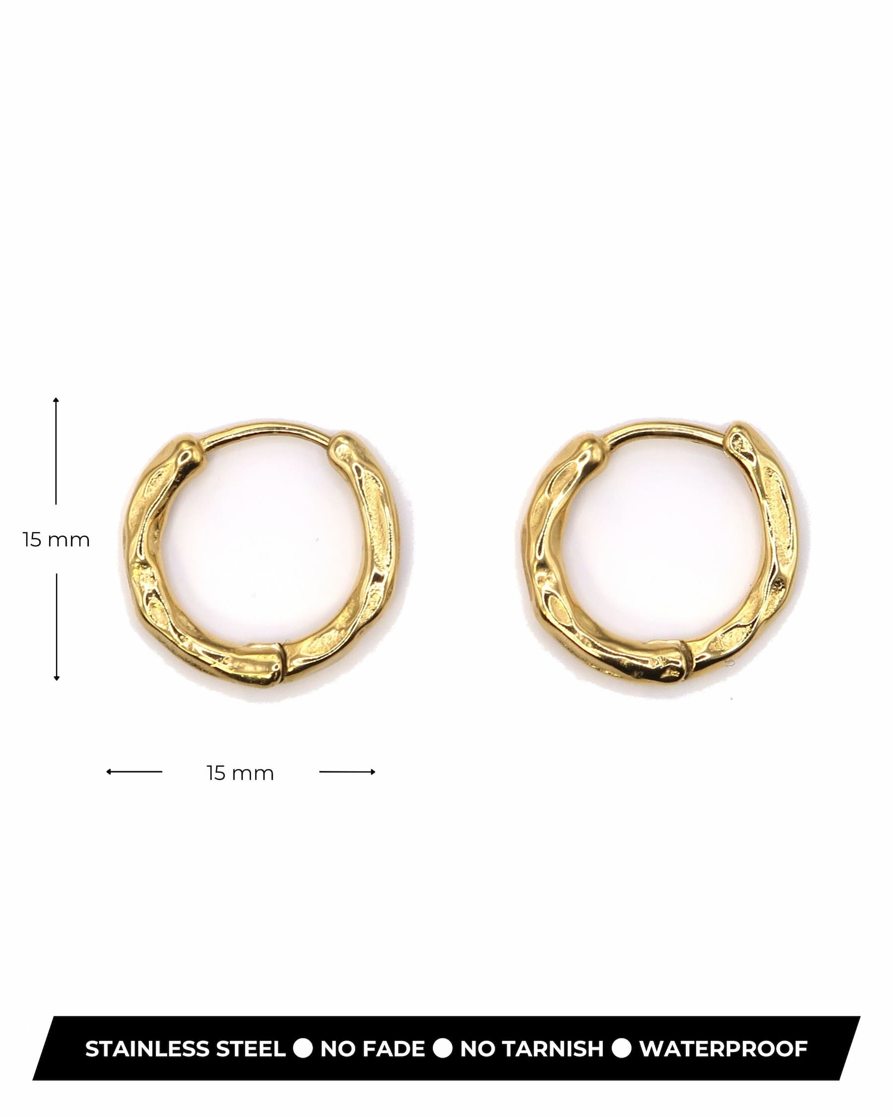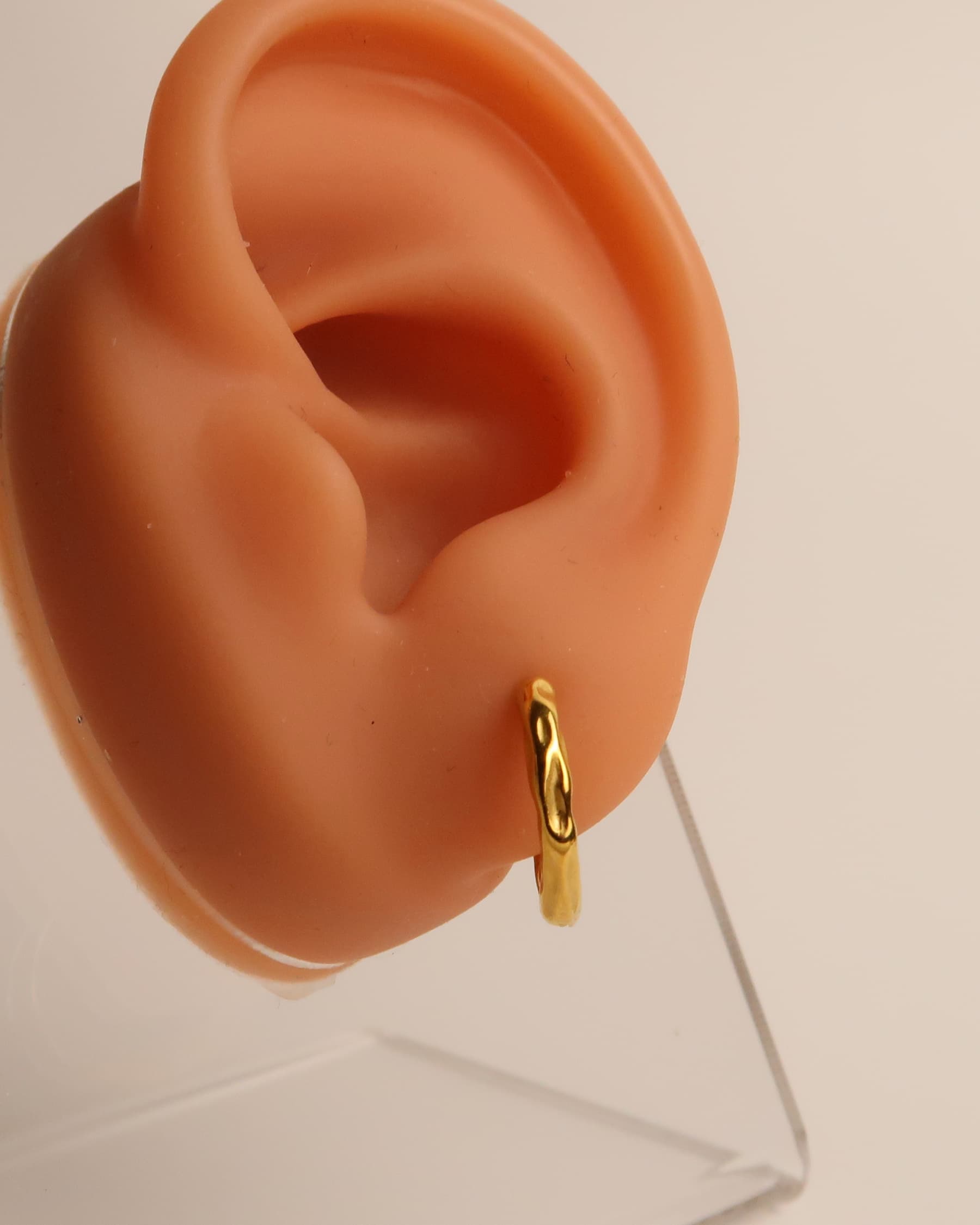 RENA ist ein Paar minimalistische Huggie-Ohrringe aus goldfarbenem Edelstahl, das mit einer dezenten, gehämmerten Textur veredelt ist. Die unregelmäßige Oberfläche fängt das Licht sanft ein und verleiht den kleinen Creolen einen modernen, organischen Look. Leicht, schlicht und elegant – ideal für den Alltag oder als dezentes Detail in deinem Earstack.