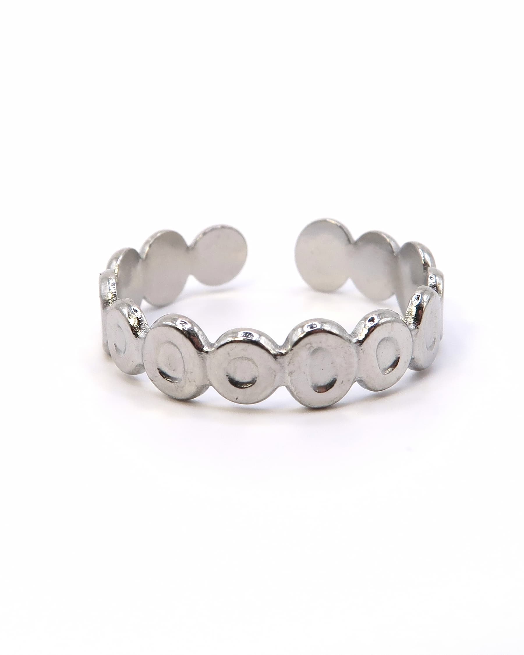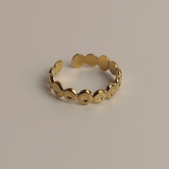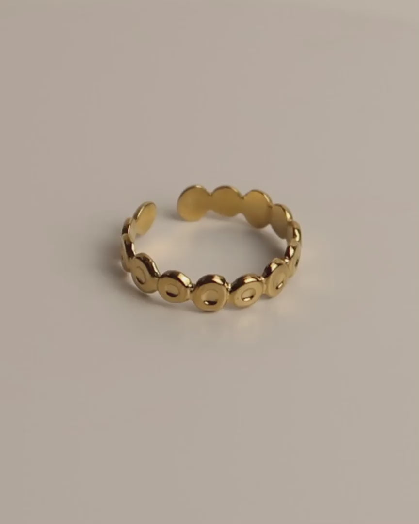 MEIJA ist ein moderner Edelstahlring in Gold und Silber, der durch sein einzigartiges, geometrisches Design besticht. Die unregelmäßig geformten Kreise mit feiner Vertiefung verleihen ihm eine spannende Struktur. Perfekt für den Alltag oder zum Kombinieren mit anderen Ringen.