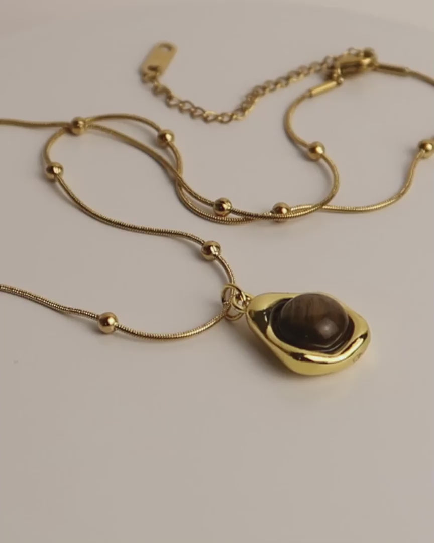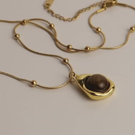 Die feine Edelstahlkette wird durch kleine, gleichmäßig gesetzte Kugeln ergänzt, die dem Design eine besondere Note verleihen. Der organisch geformte Anhänger mit schimmerndem Naturstein bringt warme, erdige Töne ins Spiel und macht MYAH zu einem stilvollen Begleiter für den Alltag.