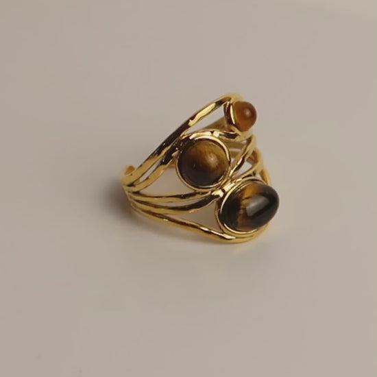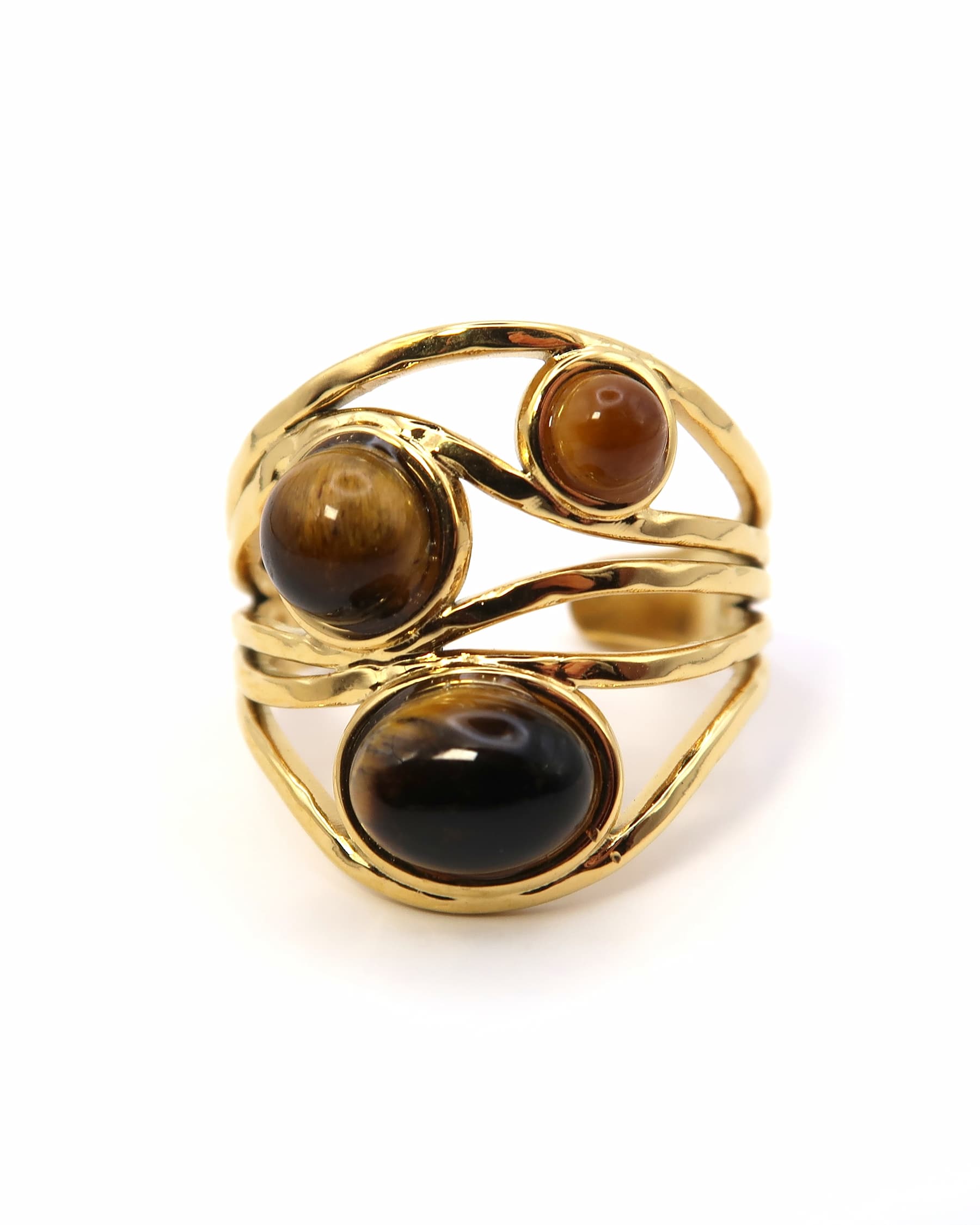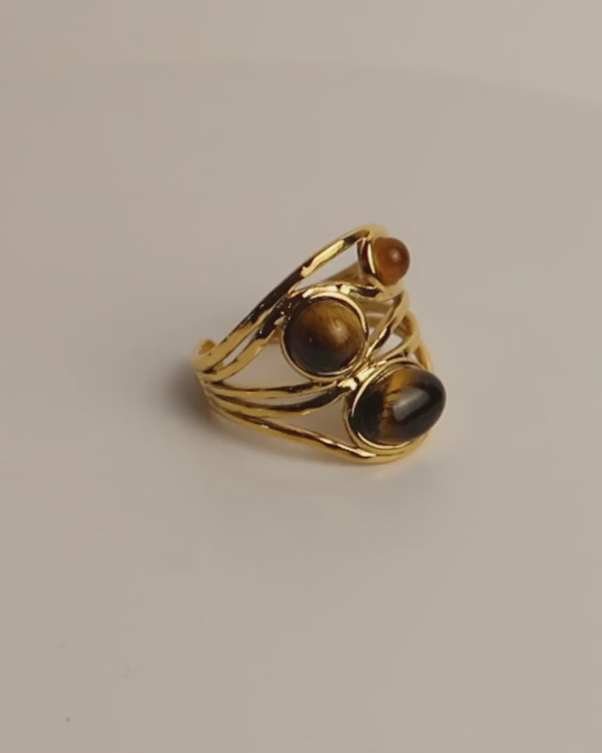 NOEMI ist ein auffälliger Boho Statement Ring aus wasserfestem Edelstahl. Mehrere geschwungene Linien bilden eine kunstvolle Form, auf der drei unregelmäßig geformte Tigerauge-Perlen sitzen. Ein kreativer, einzigartiger Ring, der jedem Look eine besondere Note verleiht.