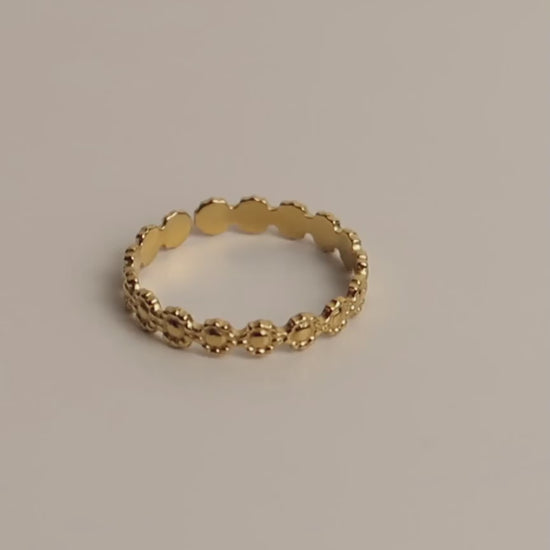Der NOLA Ring überzeugt mit feinen Blütenformen und einem eleganten Goldton. Gefertigt aus Edelstahl und flexibel größenverstellbar, eignet er sich ideal für schlichte, stilvolle Looks – solo getragen oder als Teil eines Ringstapels.