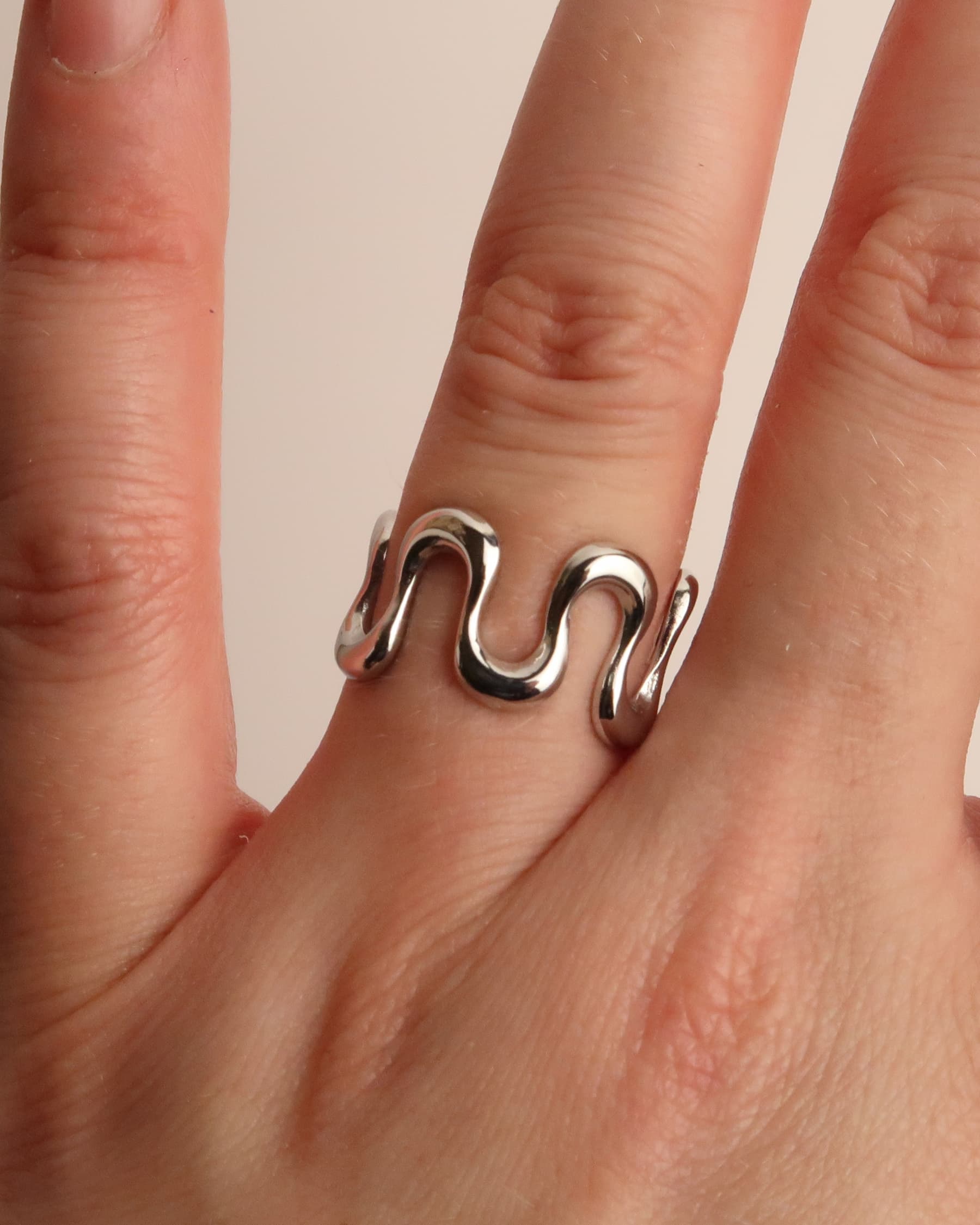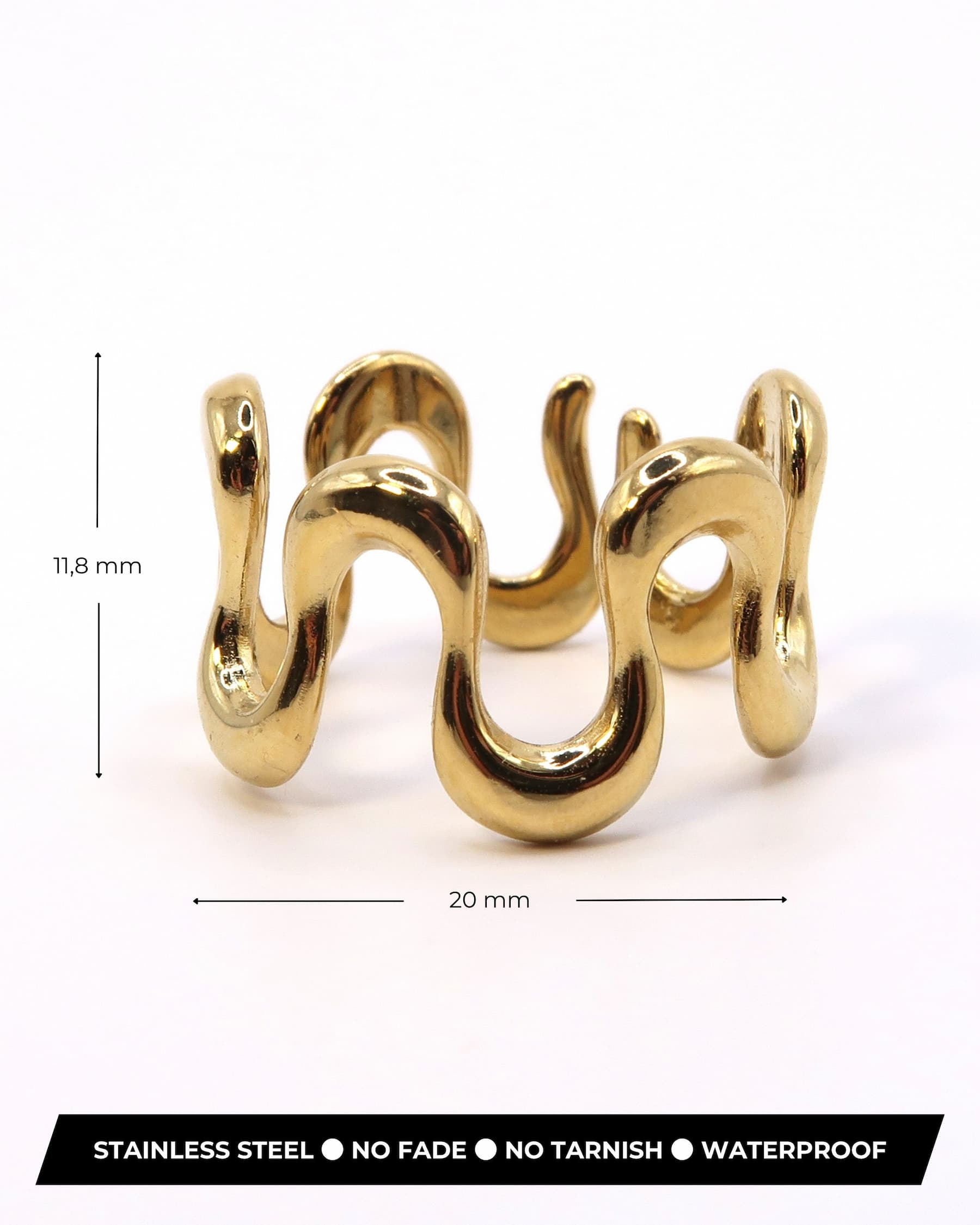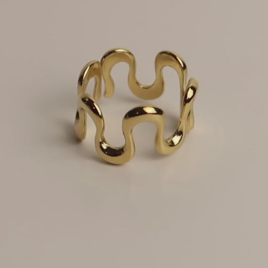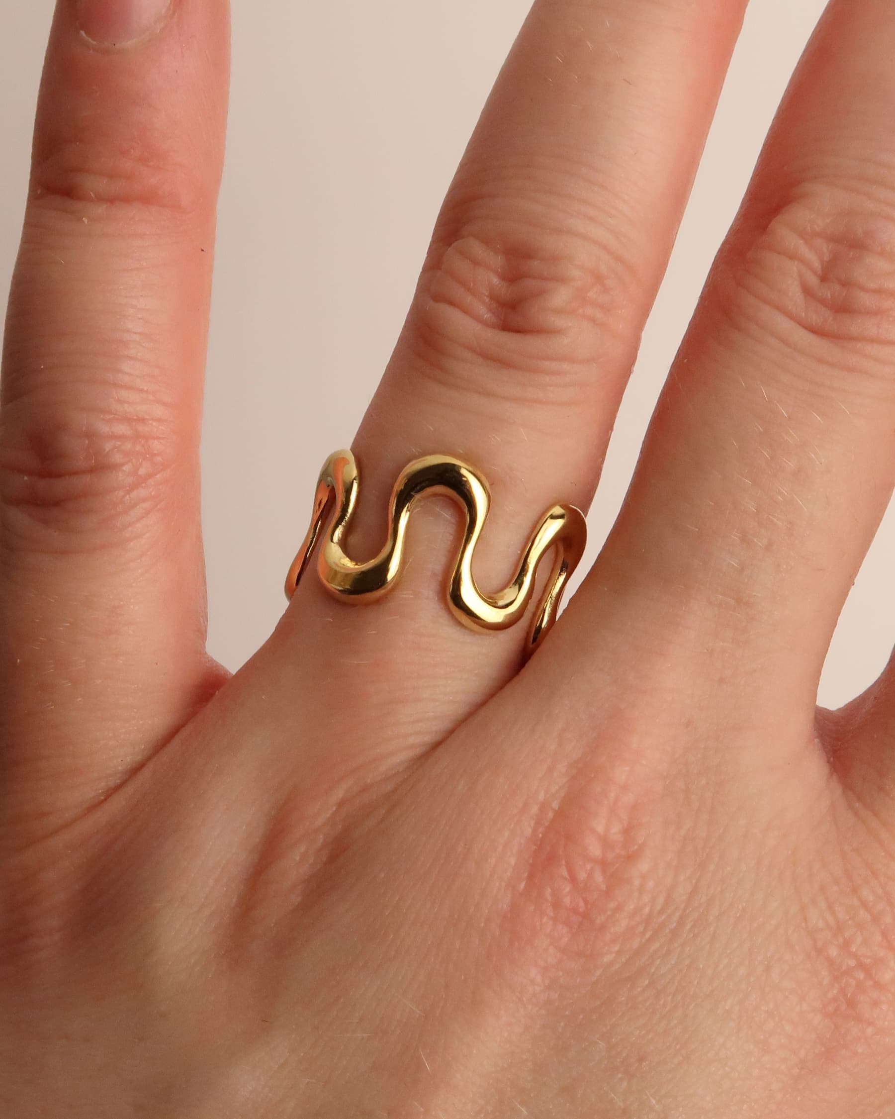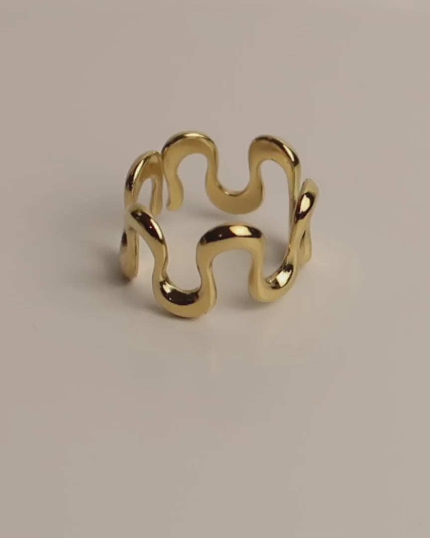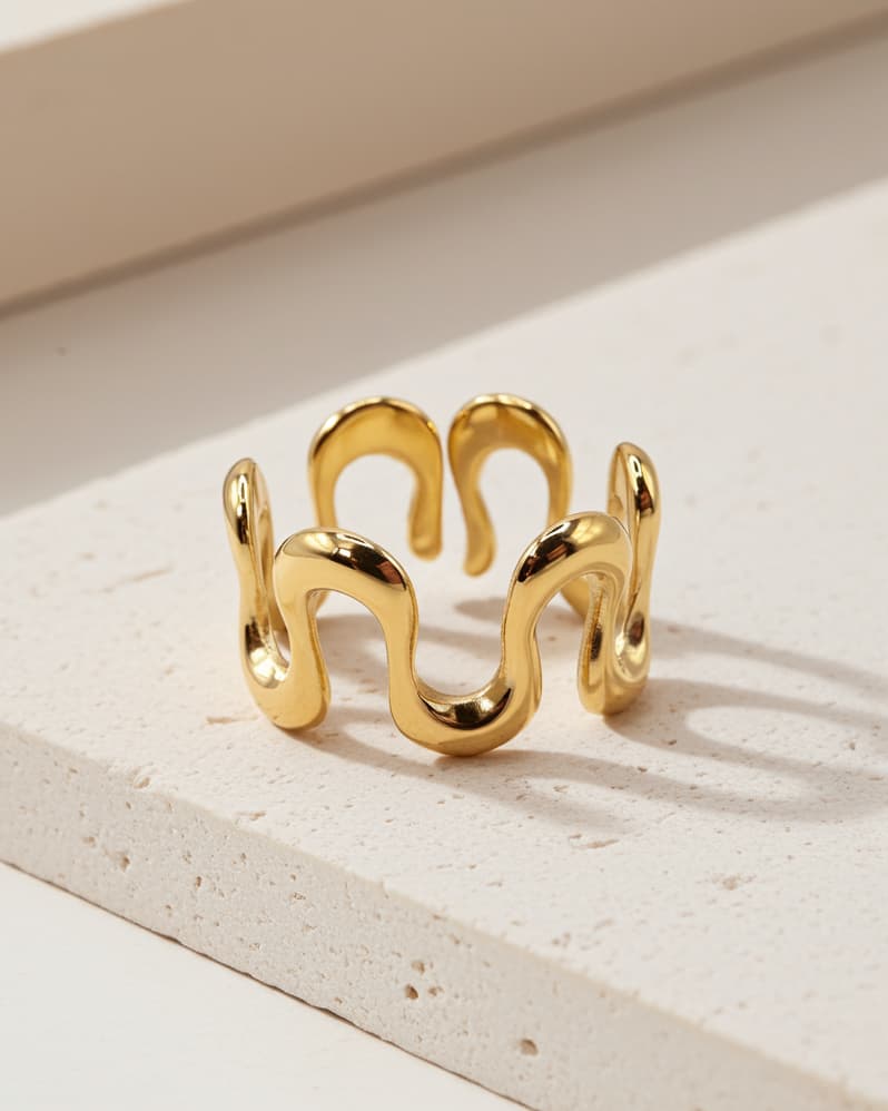 NOUR ist ein moderner, größenverstellbarer Ring aus hochwertigem Edelstahl mit wellenförmigem Design. Erhältlich in glänzendem Gold und Silber – perfekt zum Kombinieren oder als Statement-Piece. Ideal für jeden Tag und jedes Outfit.