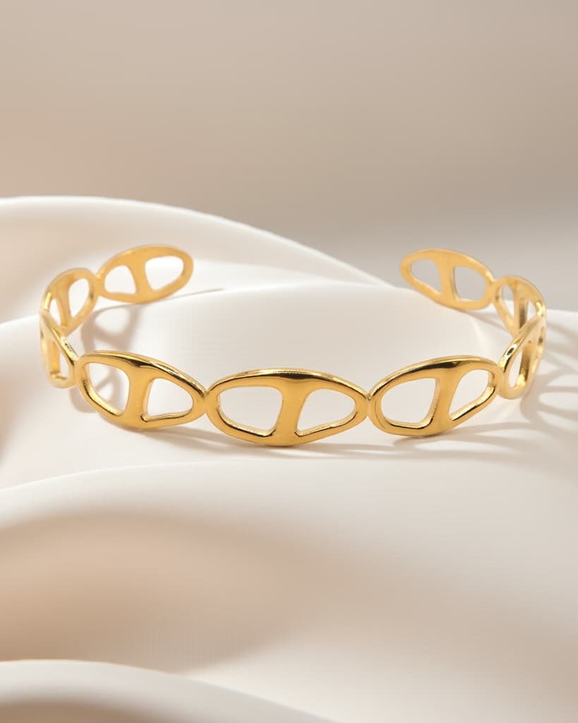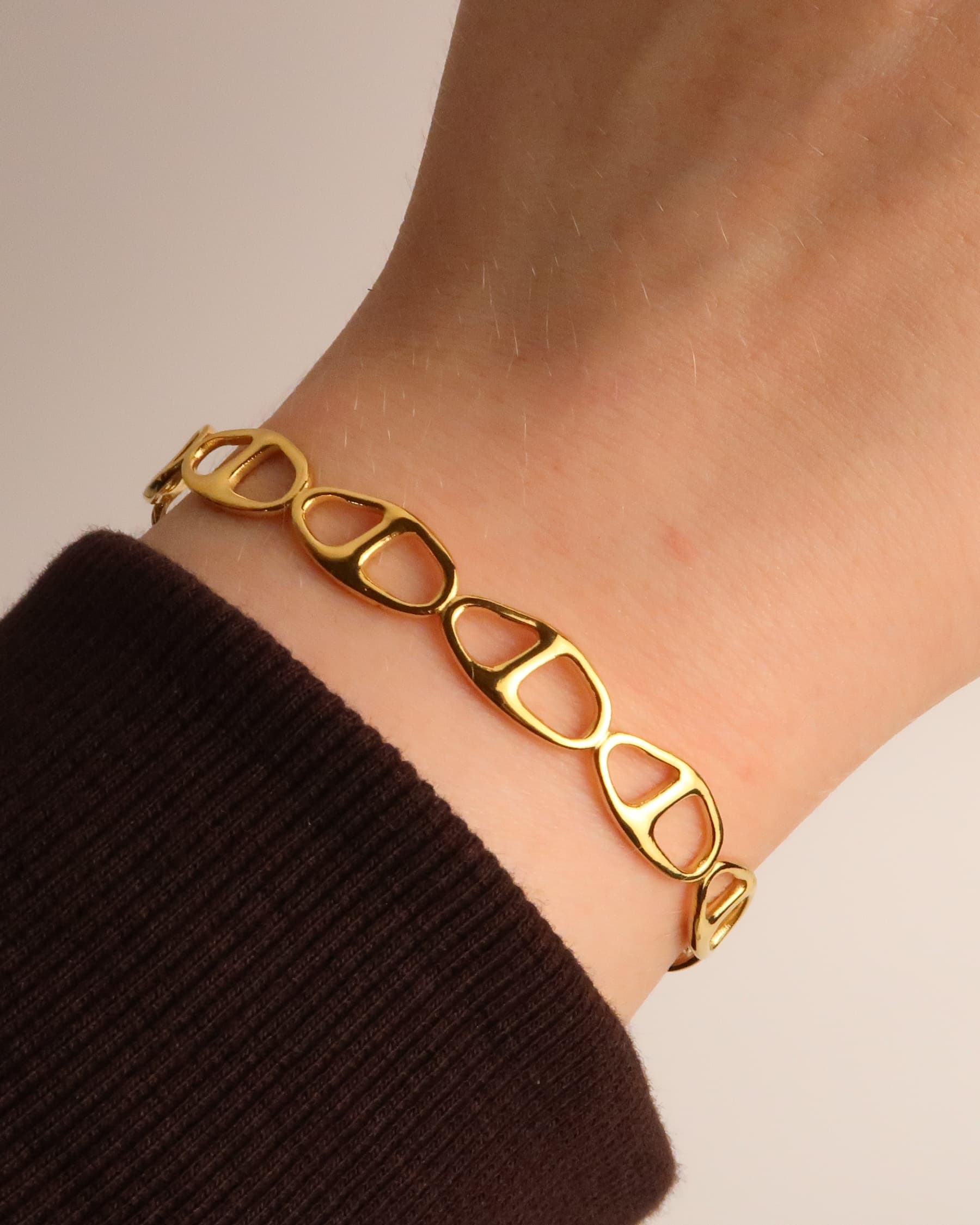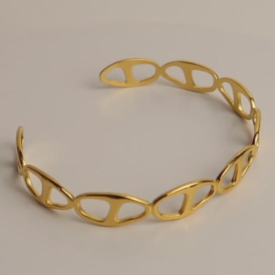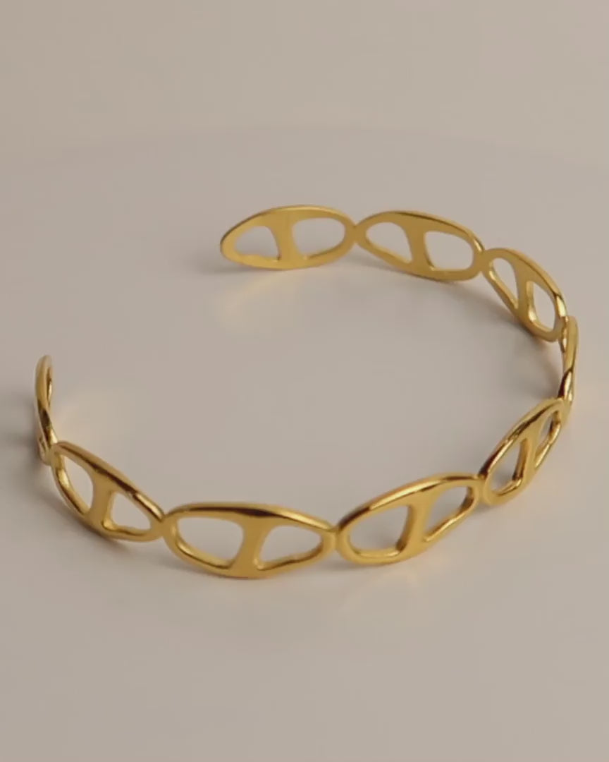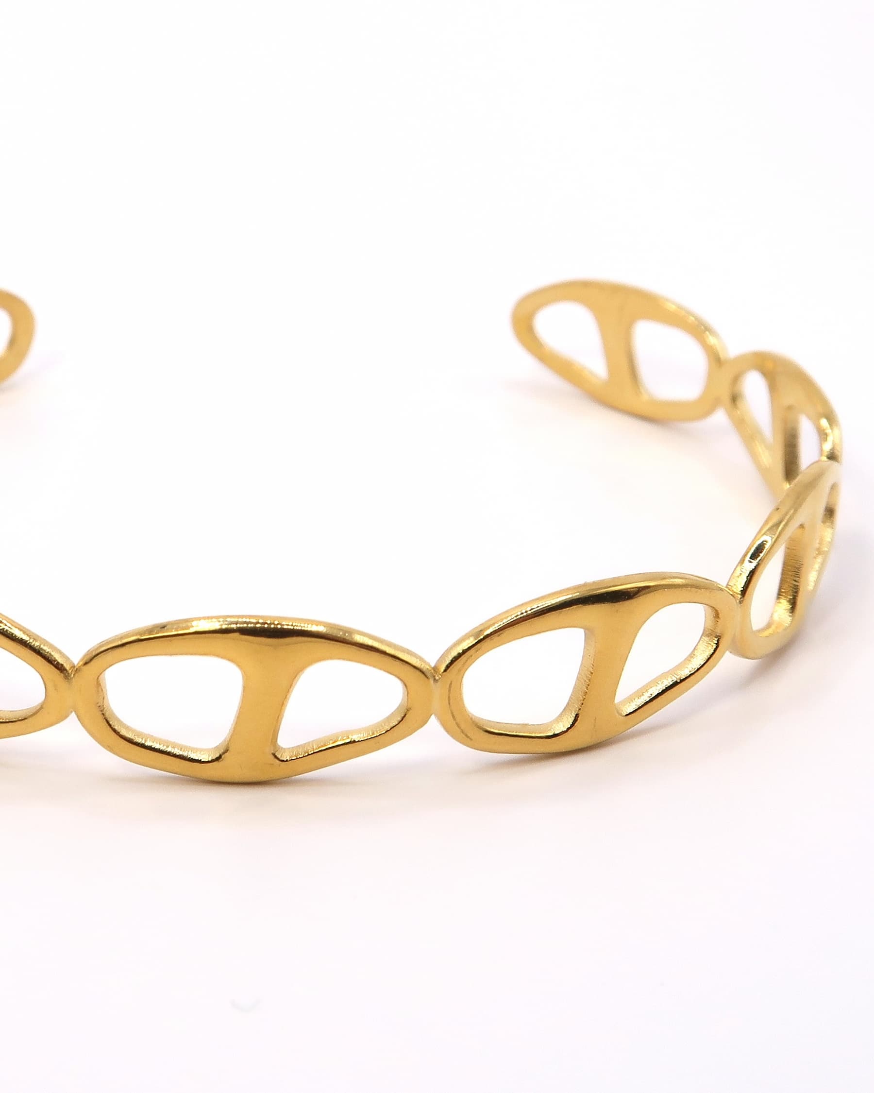 ORLA ist ein auffälliger Armreif aus goldfarbenem Edelstahl mit einem modernen, abstrakten Design. Die besondere Form erinnert an stilisierte Schweinenasen und macht das Schmuckstück zu einem echten Blickfang – perfekt für alle, die gerne mutige Akzente setzen. Robust, einzigartig und ideal für den Alltag oder besondere Outfits.