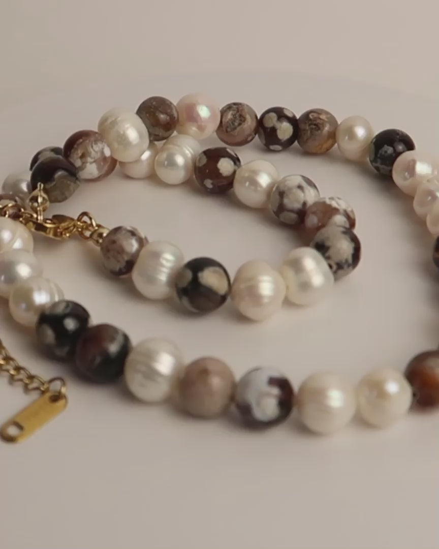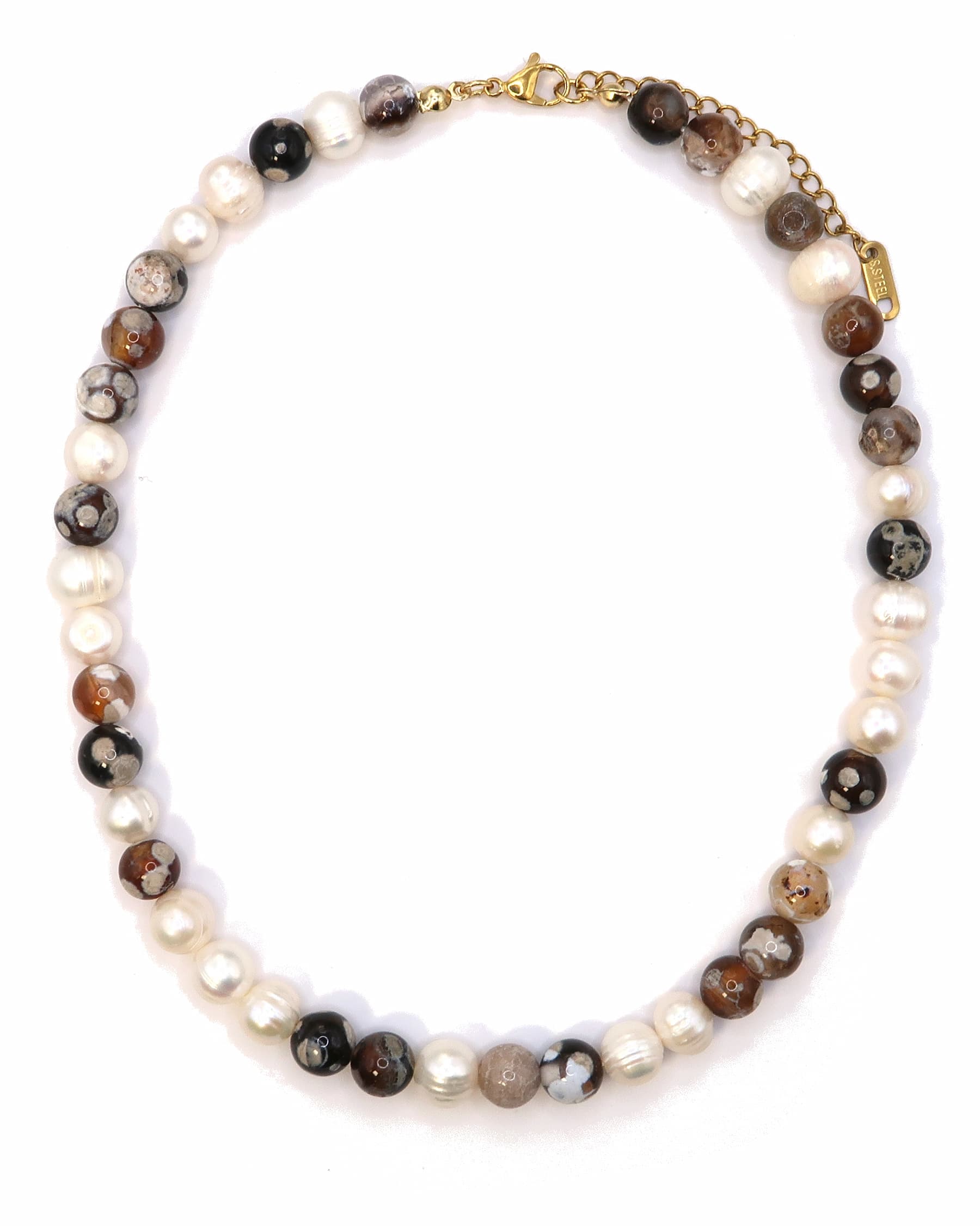 RAYA ist ein einzigartiger Perlen-Choker aus weißen Süßwasserperlen und braunen Feuer-Achat-Perlen, die sich in unregelmäßigen Abständen abwechseln. Die Kette verleiht jedem Outfit einen natürlichen, lässigen Look und eignet sich perfekt für den Alltag oder zum Layering mit anderen Halsketten.