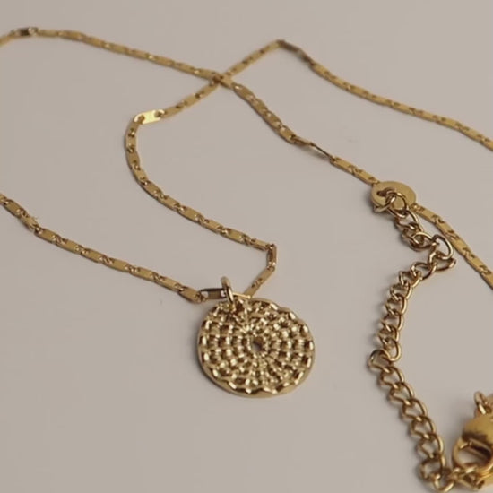 SOCCORA ist eine goldene Edelstahl Halskette im Boho-Stil mit einem Medaillon-Anhänger, inspiriert von antiken Designs. Die Kette ist zeitlos, vielseitig und perfekt zum Layern oder als dezenter Blickfang im Alltag.