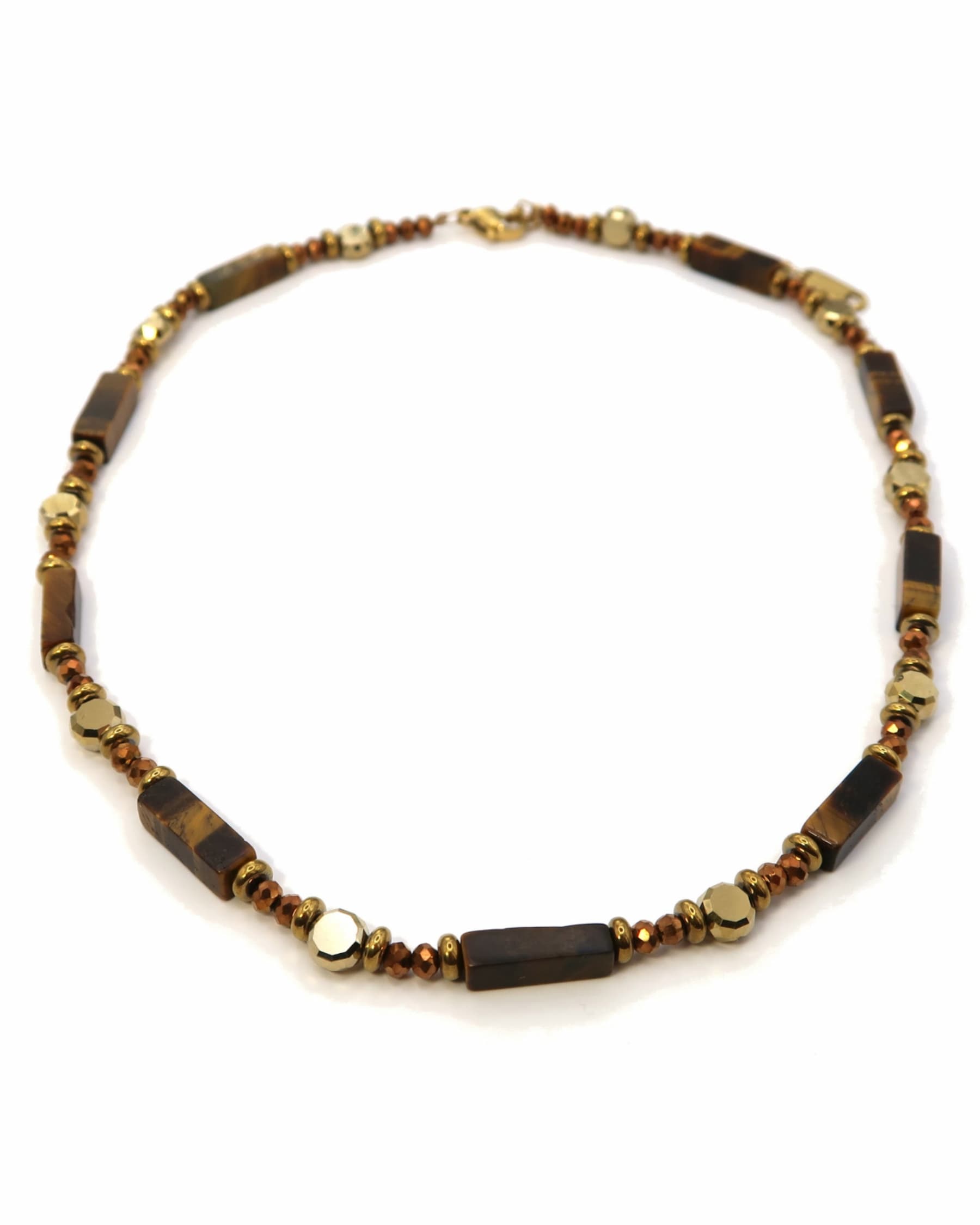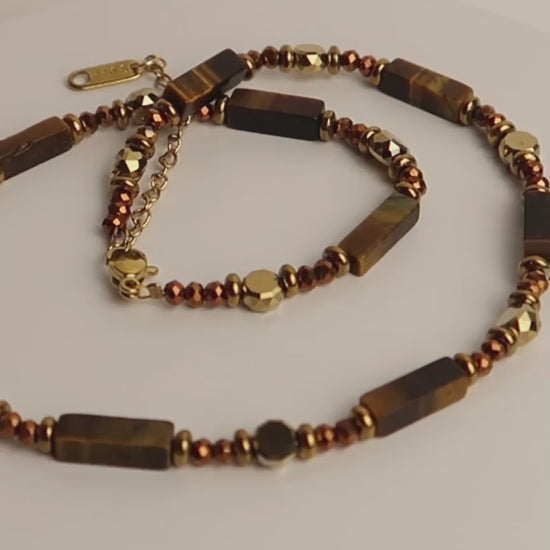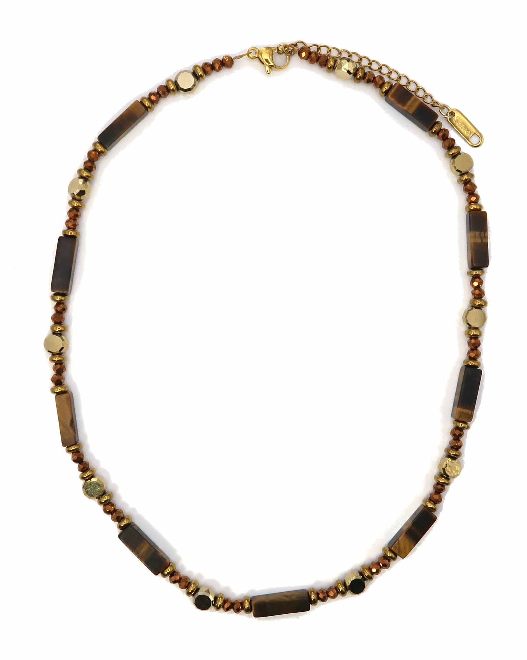 SORA ist eine elegante Perlenhalskette mit länglichen, eckigen Natursteinperlen aus braunem Tigerauge. Abwechselnd kombiniert mit facettierten gold- und bronzefarbenen Perlen und einem goldenen Edelstahlverschluss – ein natürlicher Look mit edlem Finish.