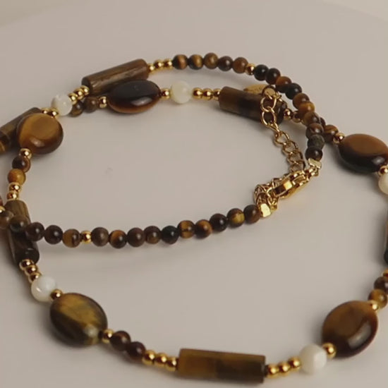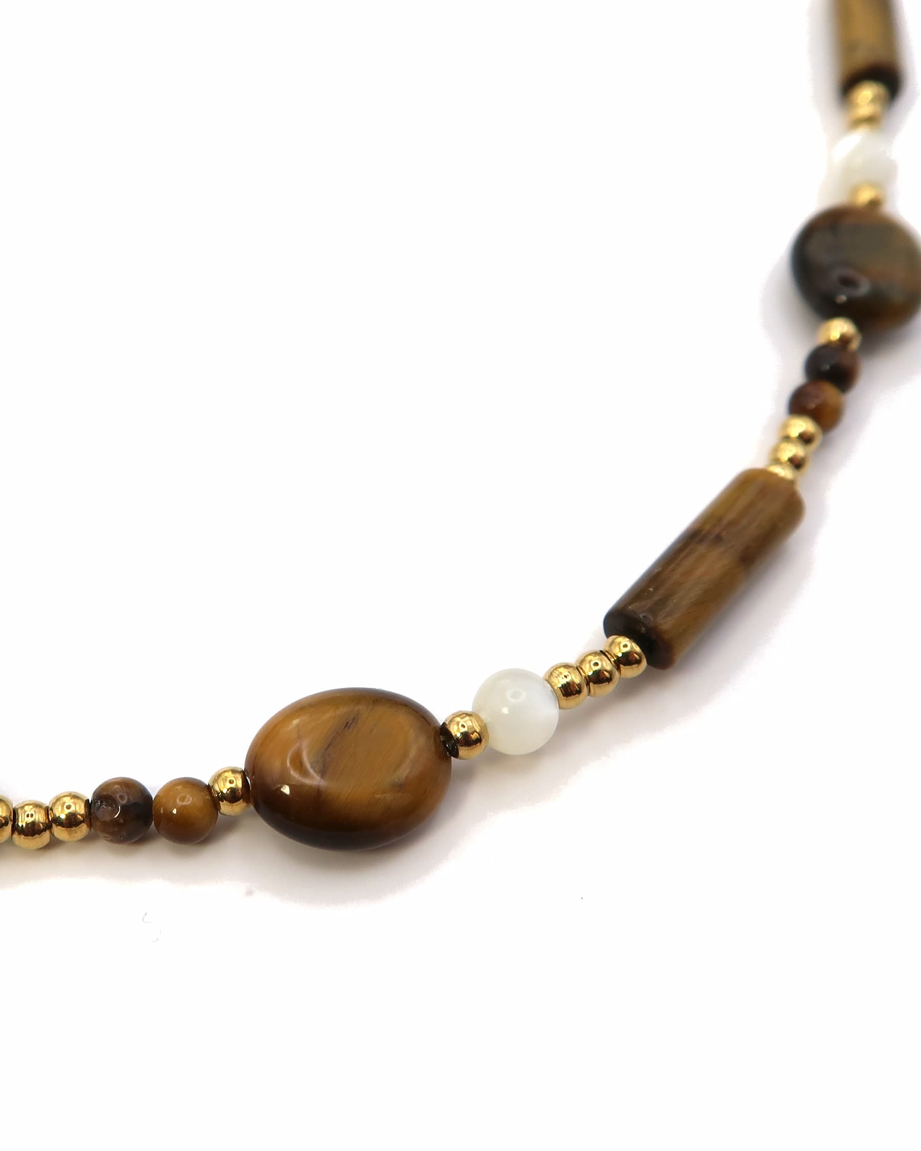 Die SUNA Kette besticht durch ihre warme, natürliche Ausstrahlung: braune Tigerauge-Perlen in ovaler und länglicher Form treffen auf goldene und weiße Akzentperlen. Das unregelmäßige Muster verleiht ihr einen handgemachten Boho-Charme – ideal für einen individuellen, erdigen Look.