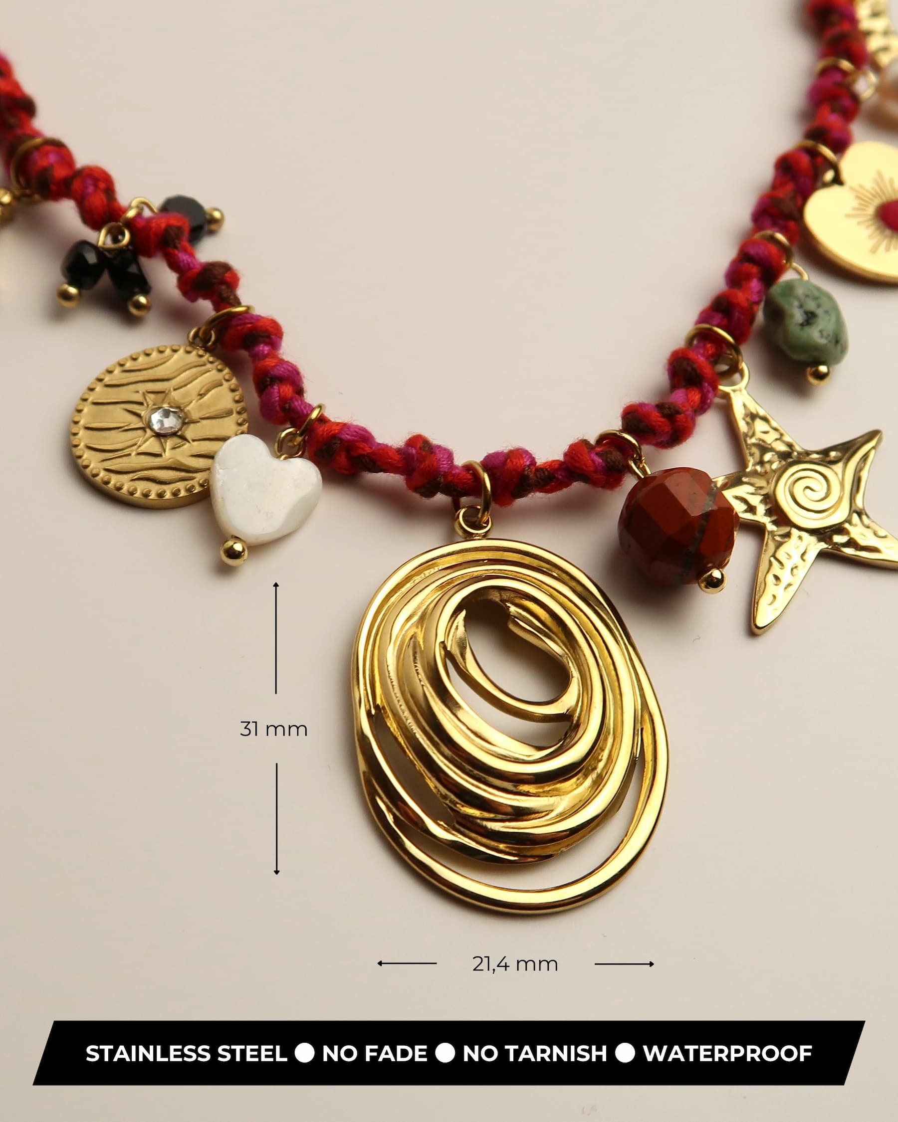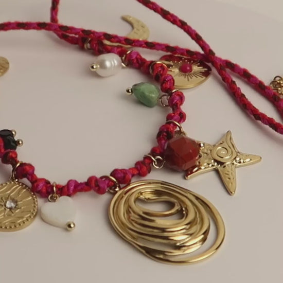 YUNA ist eine außergewöhnliche Boho-Halskette mit geflochtener roter Kordel als Basis. An ihr hängen insgesamt 13 detailreiche Edelstahl-Charms im Boho-Stil – darunter eine Spirale, Stern und Mond. Zwischen jedem Charm ist ein Naturstein-Anhänger in unterschiedlichen Farben und Formen eingearbeitet, darunter Weiß, Rot, Grün und Schwarz. Die Kombination aus strukturiertem Textil, glänzendem Metall und natürlichem Stein macht YUNA zu einem einzigartigen Statement-Piece.